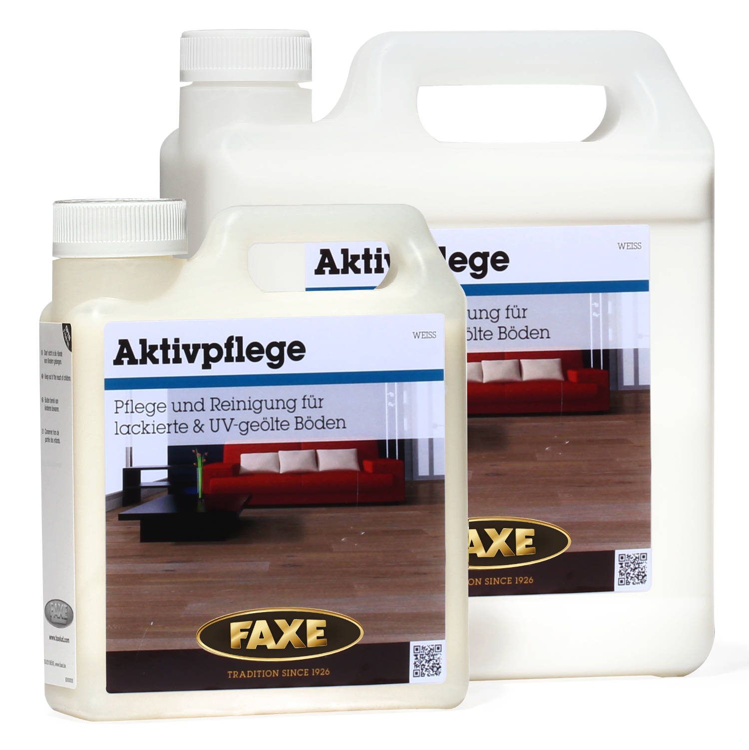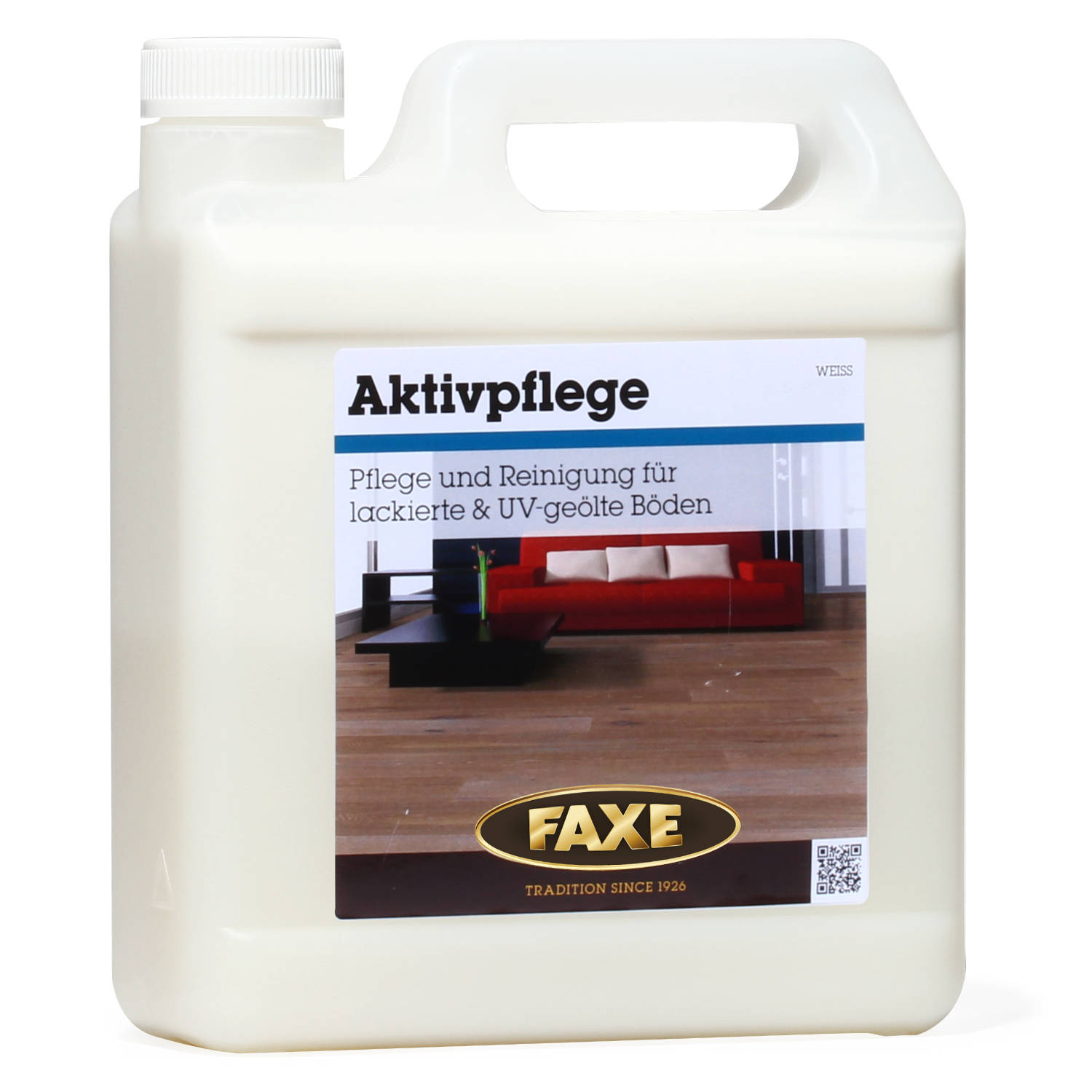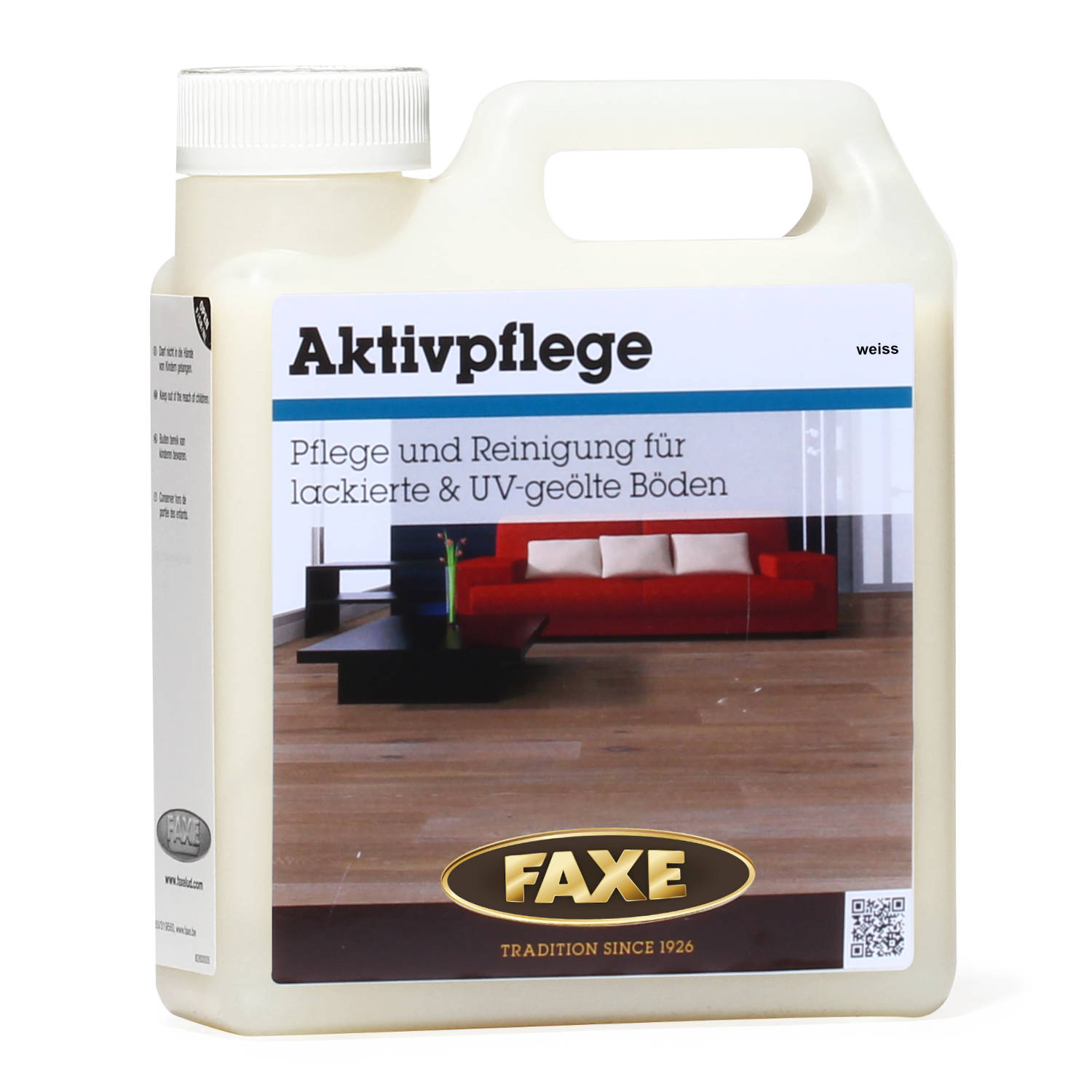 Die FAXE Aktivpflege weiß ist ein Kombiprodukt zur Reinigung- und Pflege von hellen, weiß geölten und anderen offenporig behandelten oder lackierten Oberflächen. Dabei erfüllt die FAXE Aktivpflege weiß auch die exklusivsten Ansprüche an Farbe und Glanz. Das vielseitig einsetzbare Produkt eignet sich für geölte und lackierte Holzböden ebenso wie für Kork, Linoleum, unglasierte Fliesen und Naturstein. Die FAXE Aktivpflege enthält milde, waschaktive Substanzen und pflegendes Wachs. Sie trocknet zu einem schmutz- und wasserabweisenden, pflegeleichten Schutzfilm und wird zur Reinigung einfach als Wischwasserzusatz verwendet.