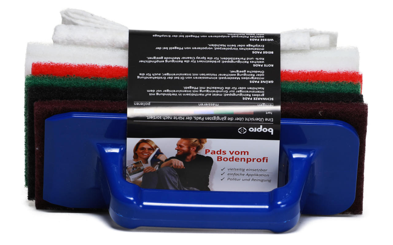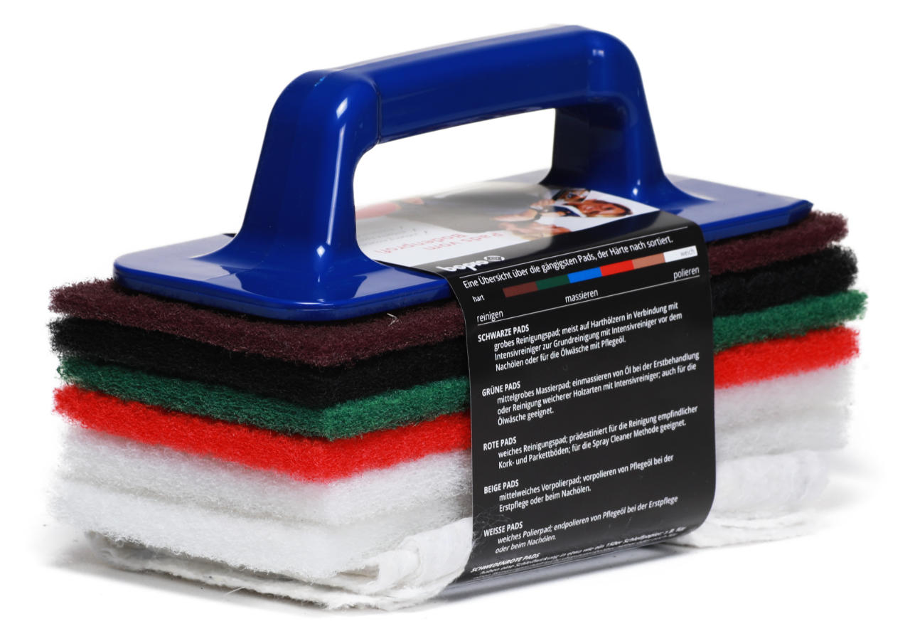 Im Lieferumfang sind Normal-Pads enthalten das Schleifpad schwedenrot für den Zwischenschliff, schwarze Reinigungspads für intensive Reinigungsarbeiten, grüne Massierpads zum Reinigen von empfindlichen Oberflächen und zum Einmassieren von Öl und Pflegeprodukten, rote Pads zum Einmassieren von Öl und Pflegeprodukten oder leichten Reinigungsarbeiten und weiße Pads zum Polieren der behandelten Fläche enthalten. Ein ergonomischer Padhalter für effizientere Arbeitsabläufe rundet das vorteilhafte Angebot ab.