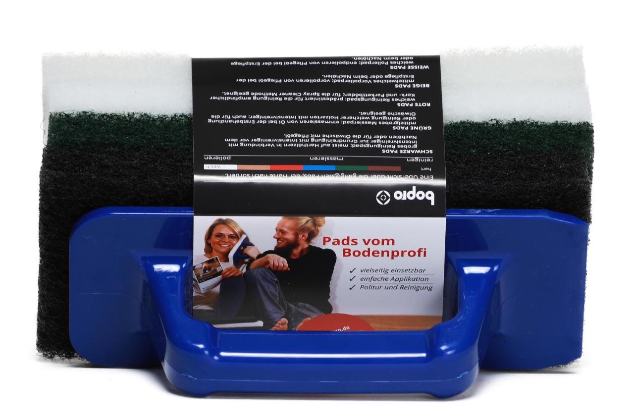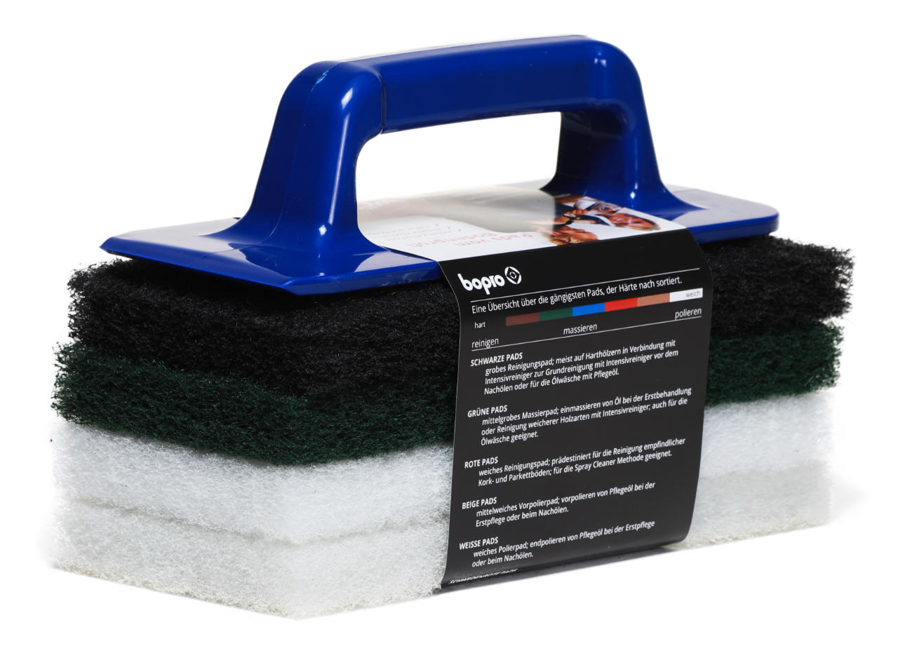 Im Lieferumfang sind schwarze Pads zum Reinigen von Holzoberflächen, grüne Pads zum Einmassieren von Öl und Pflegeprodukten und weiße Pads zum Polieren der behandelten Fläche enthalten. Ein ergonomischer Padhalter für effizientere Arbeitsabläufe rundet das vorteilhafte Angebot ab.