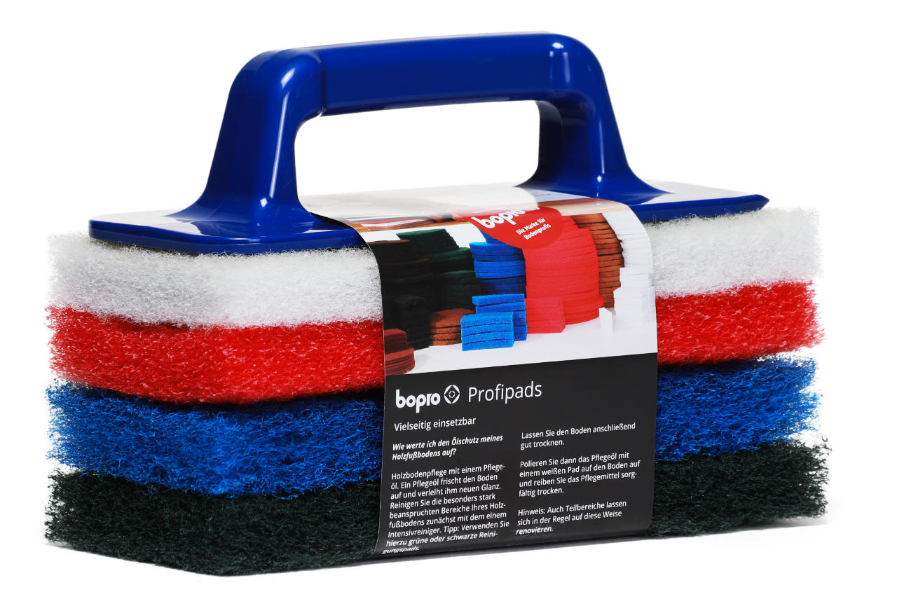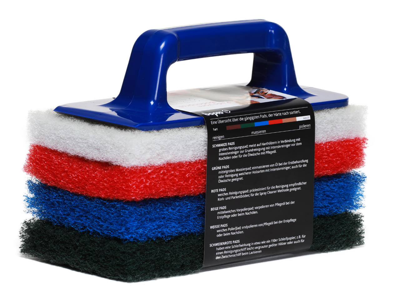 Im Lieferumfang sind grüne Pads zum Reinigen von Holzoberflächen, blaue Pads zum Reinigen von Weichholz oder elastischen Oberflächen, rote Pads zum Einmassieren von Öl und Pflegeprodukten oder leichten Reinigungsarbeiten und weiße Pads zum Polieren der behandelten Fläche enthalten. Ein ergonomischer Padhalter für effizientere Arbeitsabläufe rundet das vorteilhafte Angebot ab.