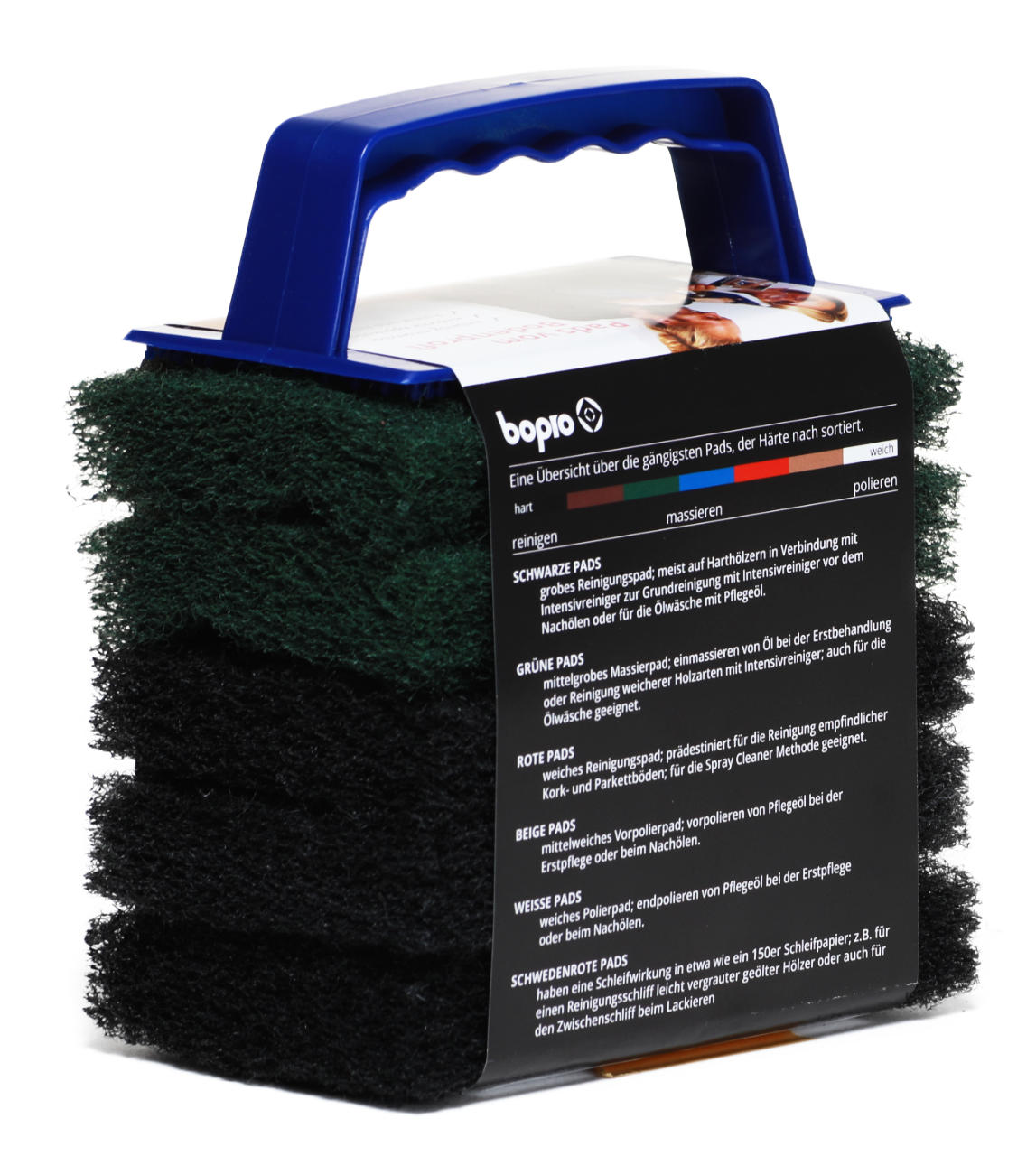 Im Lieferumfang sind schwarze Pads zum Reinigen von Holzoberflächen und grüne Pads zum Einmassieren von Öl und Pflegeprodukten enthalten. Ein ergonomischer Padhalter für effizientere Arbeitsabläufe rundet das vorteilhafte Angebot ab.