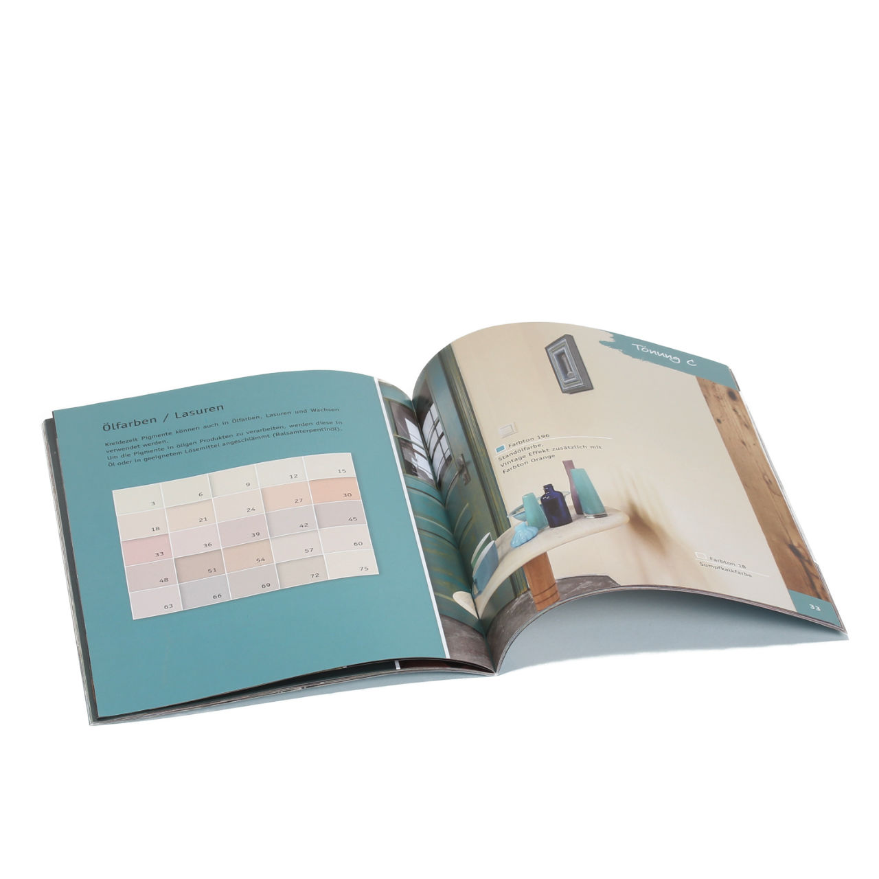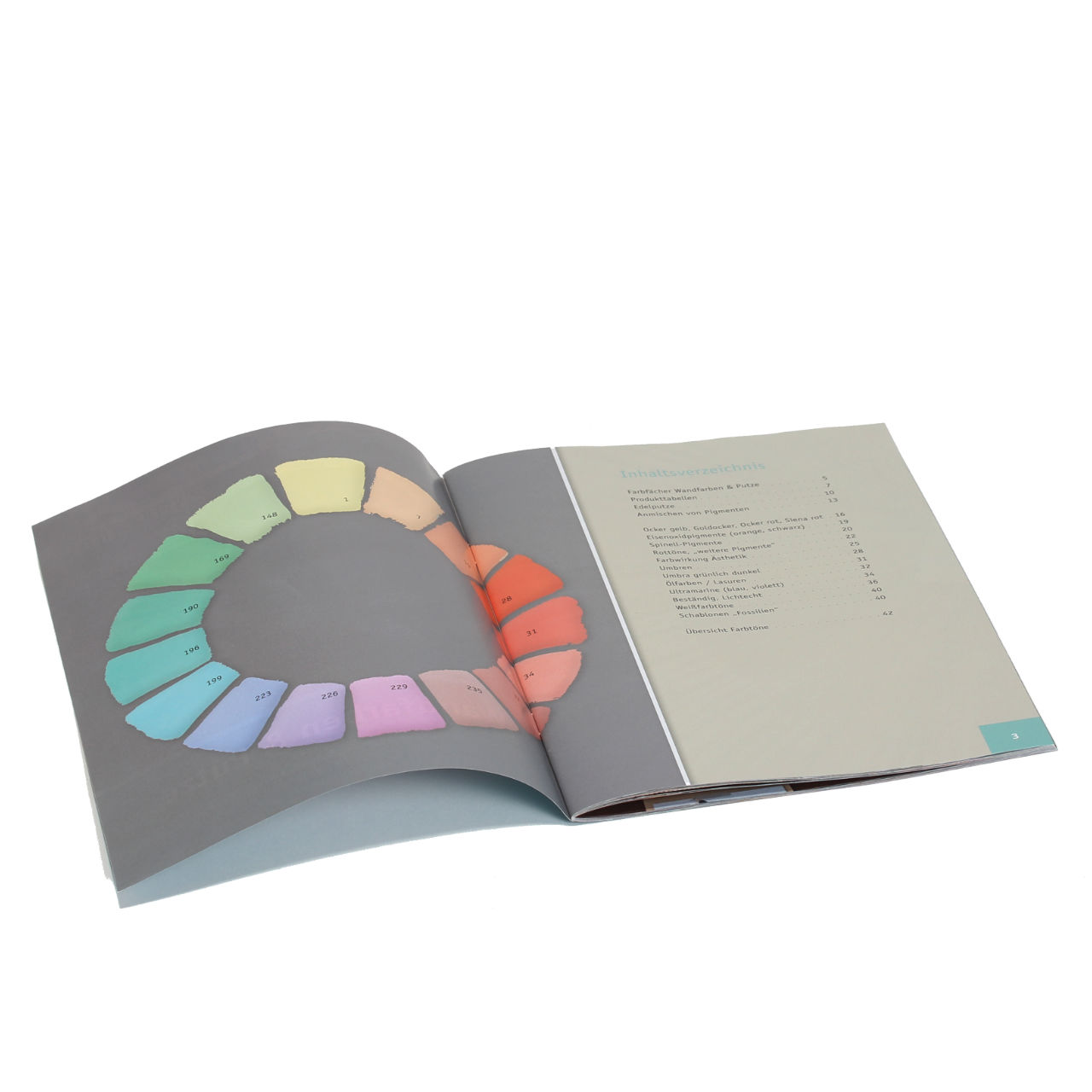 Diese kleine Broschüre (Din A5) zeigt 250 Farbtöne, hergestellt aus 24 Erd- und Mineralpigmenten. Die Farbtöne setzen sich aus einem oder zwei Pigmenten zusammen und werden jeweils in drei Tönungen (A, B, C) dargestellt, zuzüglich 10 Weißfarbtönen in der Abtönung D.