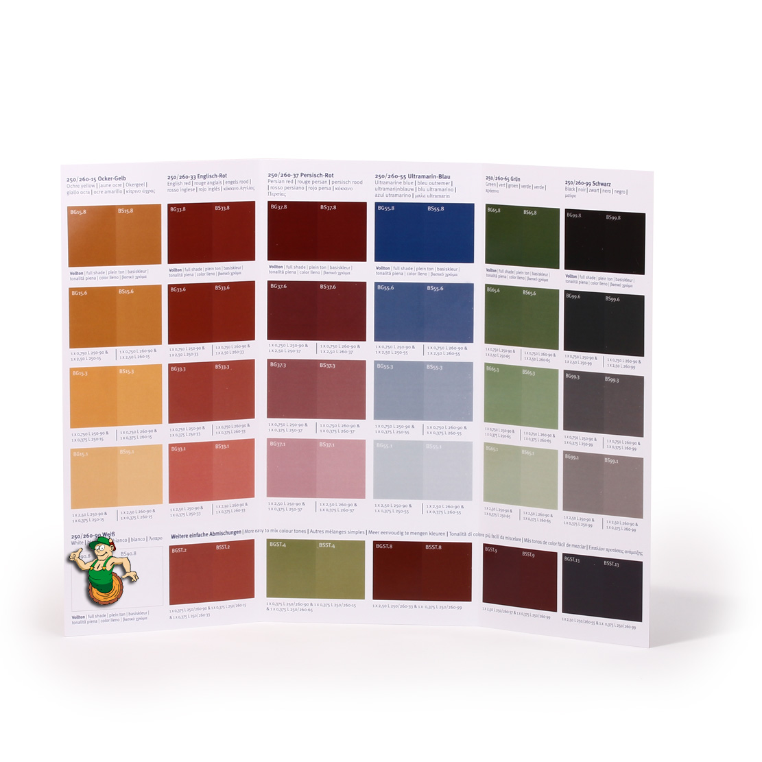 Den Buntlack Nr. 250 gibt es in 6 Farbtönen, diese können untereinander gemischt werden. Eine Übersicht erhalten Sie in der Farbkarte.