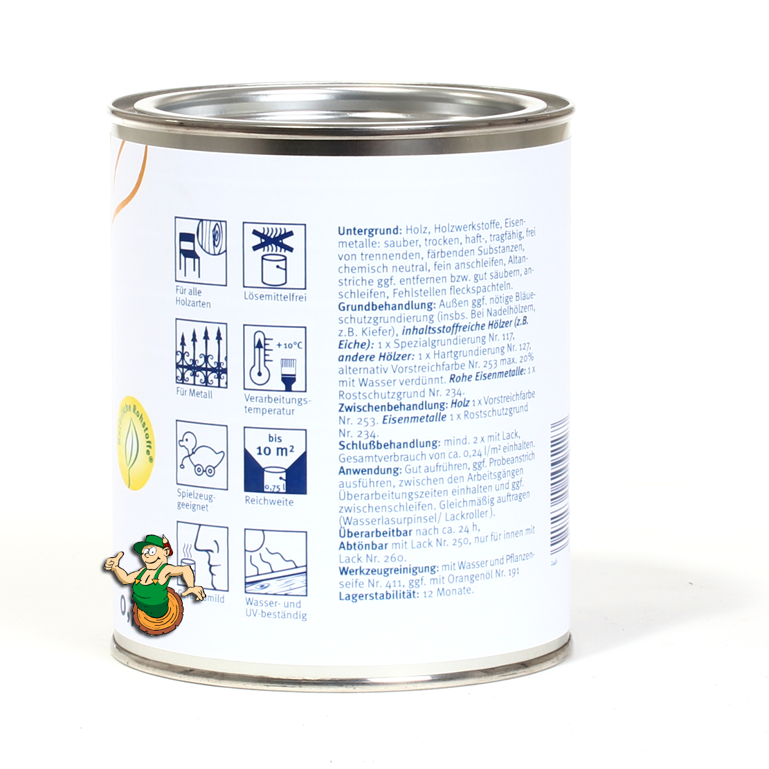 Ein glänzender, lösemittelfreier Lack für Möbel und Metallanstriche, Holzobjekte oder -werkstoffe im Innen- oder Außenbereich. Auf Speichel- und Schweißechtheit geprüft sowie vom AgBB geprüft und empfohlen. Daneben zeichnet sich der Lack durch eine hohe Witterungsbeständigkeit aus, außerdem ist er schnelltrocknend und nahezu geruchsfrei. Bei inhaltsstoffreichen Hölzern empfehlen wir eine Vorbehandlung mit Spezialgrundierung Nr. 117, bei anderen Hölzern Hartgrundierung Nr. 127.