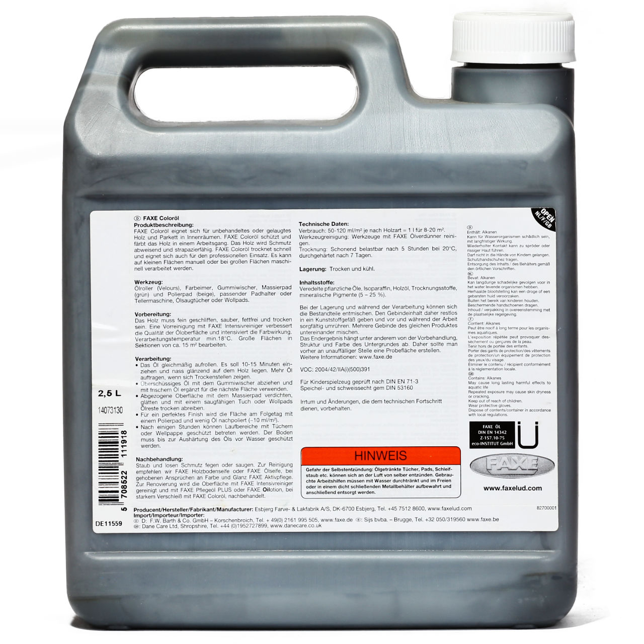 Das FAXE Coloröl wird für unbehandeltes oder gelaugtes Massivholz und Parkett im Wohn- und Objektbereich verwendet. Das Coloröl schützt und färbt das Holz in einem Arbeitsgang und macht es schmutzabweisend und strapazierfähig. Das FAXE Coloröl trocknet schnell und eignet sich auch für den professionellen Einsatz. Es kann auf kleinen Flächen manuell oder bei großen Flächen maschinell verarbeitet werden.