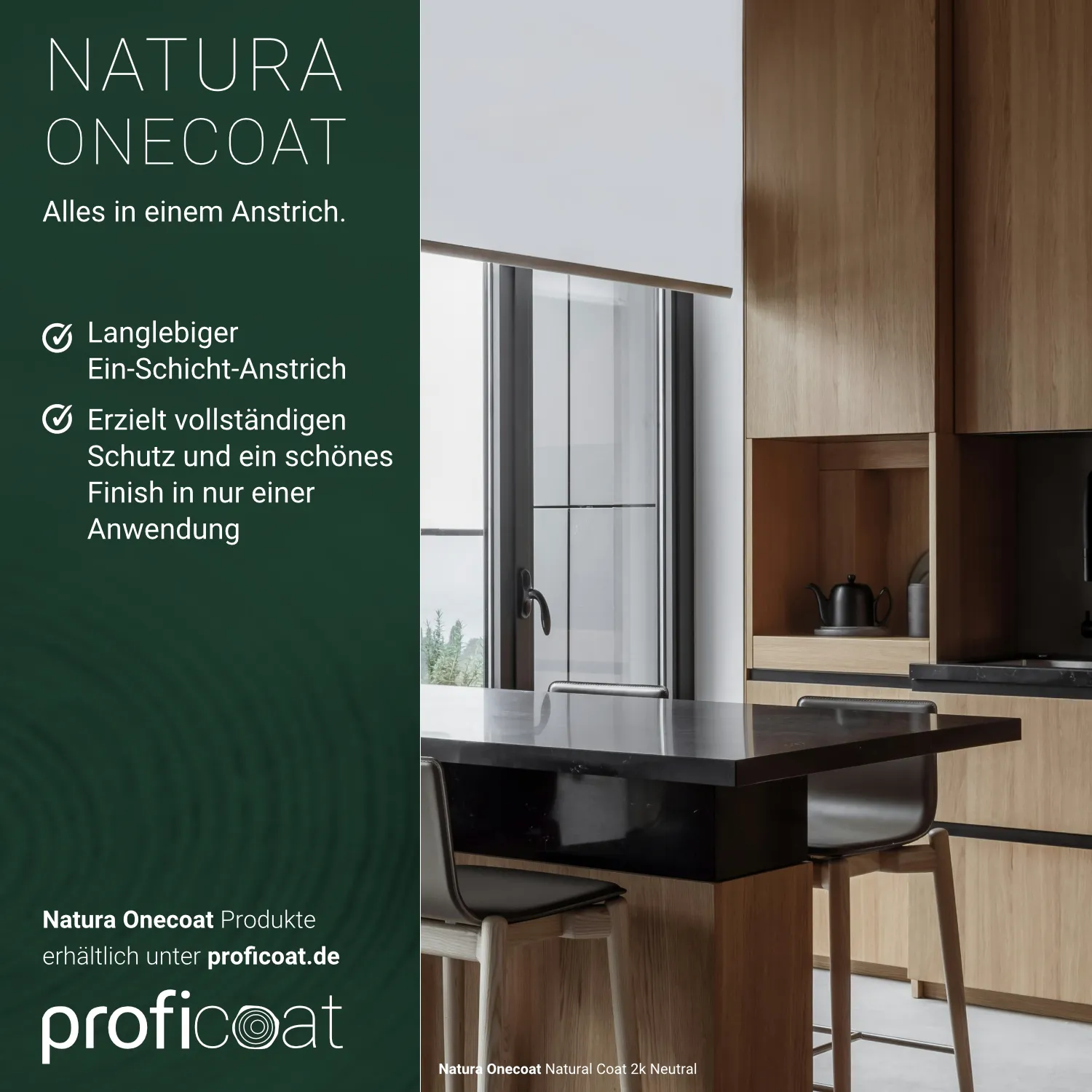 Einfache Anwendung und Pflege – Natura Onecoat Holzöl 2K ist schnell aushärtend und hat einen sehr geringen milden Geruch. Nach dem Auftragen ist die Holzoberfläche nach bereits 1 Stunde berührtrocken, innerhalb von 5 Tagen härtet das Öl vollständig aus.
