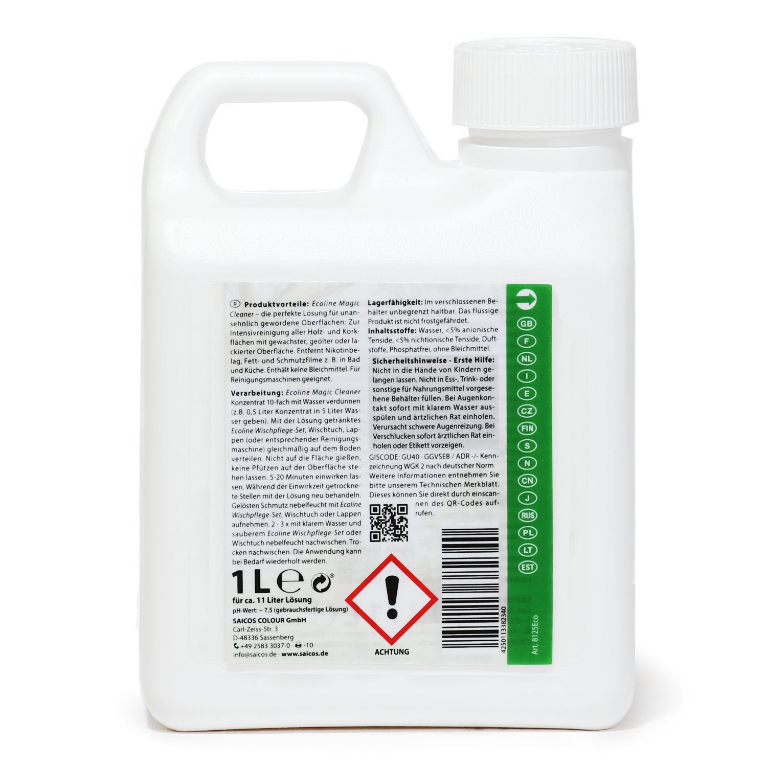 Mit dem Magic Cleaner aus der Produktreihe Ecoline von SAICOS erhalten Sie die perfekte Lösung für alle unansehnlichen und verschmutzten Oberflächen. Der Intensivreiniger ist für alle geölten, gewachsten oder lackierten Kork- und Holzoberflächen gedacht und entfernt Fett- und Schmutzfilme wie auch Nikotinbeläge gründlich. Tipp: Der Ecoline Magic Cleaner kann auch für die Grundreinigung von Oberflächen aus PVC, Linoleum, Keramik, Fliesen und Naturstein verwendet werden. Er eignet sich allerdings nicht für die Reinigungs unbehandelter Kork- und Holzoberflächen, da eine spätere Beschichtung hierdurch nämlich erschwert werden kann. Bei alkalisch empfindlichen Hölzern, die einen hohen Gerbsäureanteil besitzen (z.B. Eichen- oder Kastanienholz) kann der Magic Cleaner bei einer unsachgemäßen Anwendung Verfärbungen verursachen. Das Anlegen einer Probefläche an einer versteckten Stelle ist deshalb zu empfehlen.