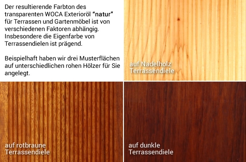 Grundsätzlich können Sie das WOCA Exterior Öl Terrassenöl auf allen Holzarten anwenden - sofern das Holz nichtimprägniert ist. Bitte beachten Sie, dass das resultierende Farbergebnis stark vom natürlichen Farbton des Holzes abhängt.