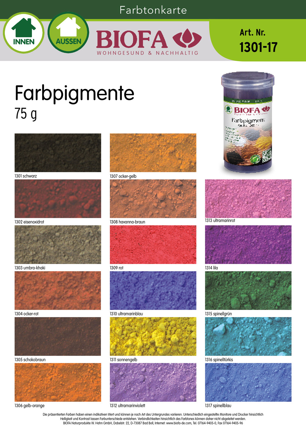 Farbstarke Pigmente von Erdfarben, Metalloxiden und Mischoxiden. Die Pigmente sind auch untereinander mischbar und können zur Farbgestaltung in die BIOFA Wandsysteme PRIMASOL Wandfarbe 3011, SOLIMIN Mineralfarbe 3051, SOLIMIN Quarzstreichputz 3055 und Lasurmalmittel 3110 eingesetzt werden. Sie sind bis auf das Pigment 1314 lila alkalibeständig. Dieses darf nicht in alkalische Systeme (z. B. Kalk- oder Silikatfarben) eingebracht oder auf alkalisch reagierende Untergründe wie z. B. neuer Beton, kalk- und zementhaltige Putze, Kalk- und Silikatanstriche aufgetragen werden, da sonst die Gefahr von Farbveränderungen besteht! Der Einsatz in Lacken, Holzlasuren, Ölen wird nicht empfohlen.