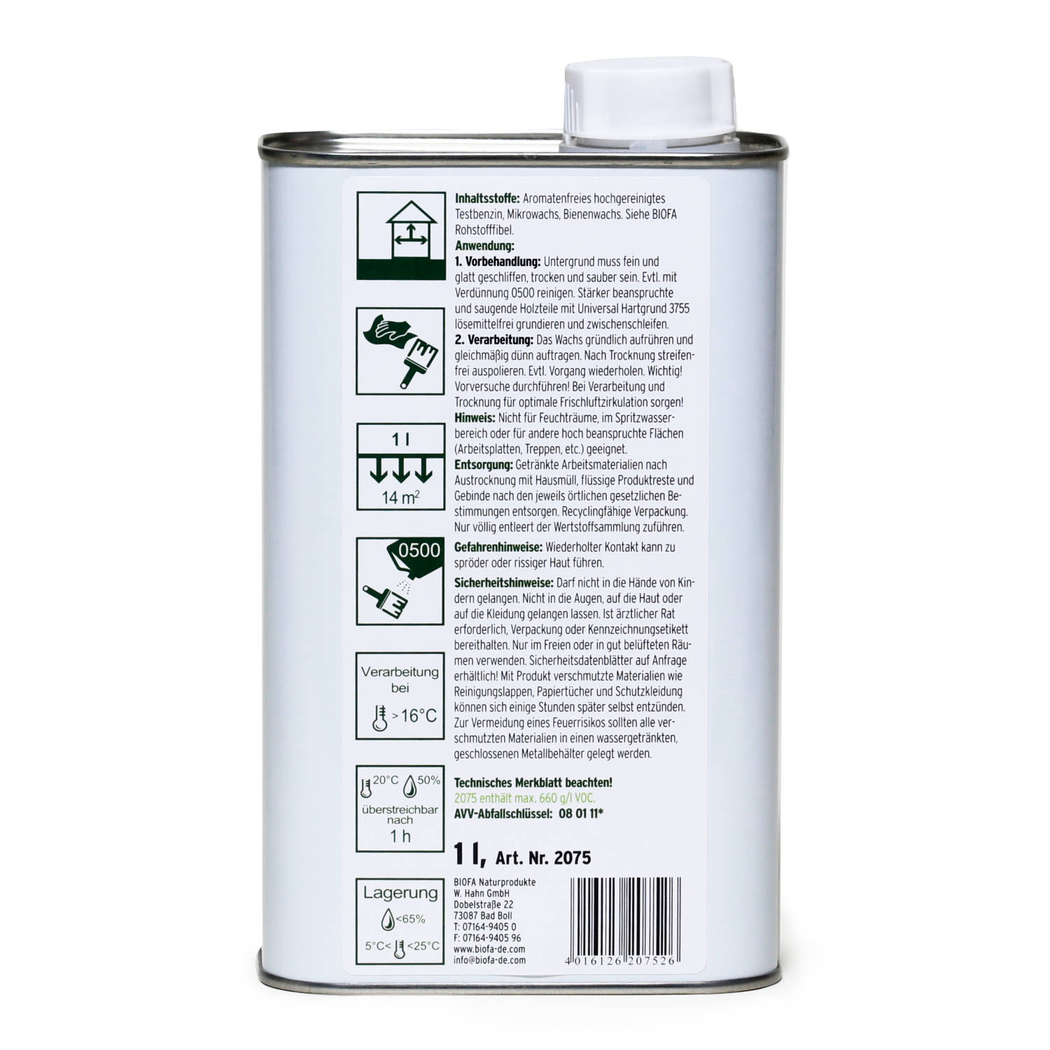 Aromatenfreies hochgereinigtes Testbenzin, Mikrowachs, Bienenwachs.