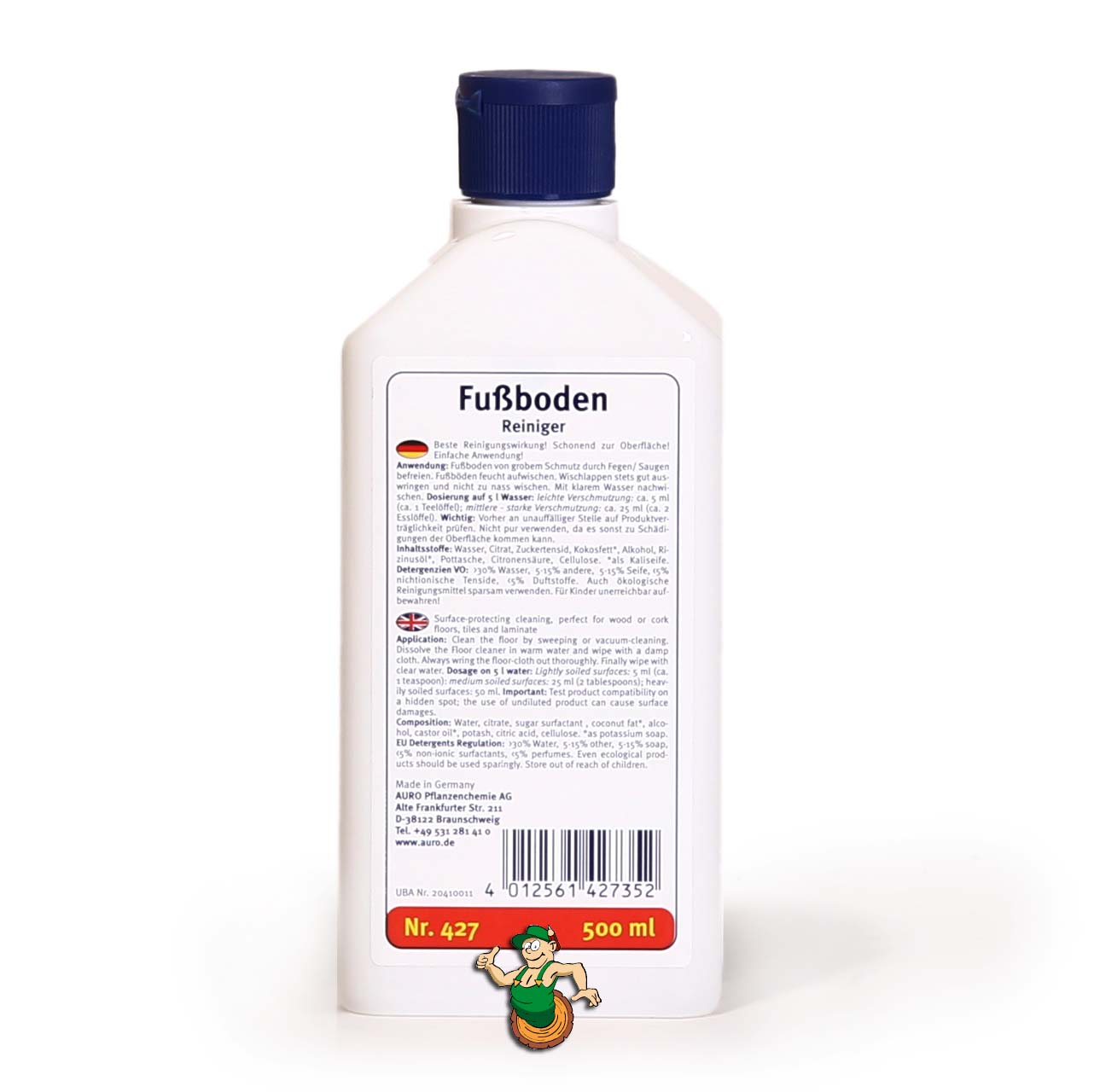 Der AURO Fußboden-Reiniger Nr. 427 ist ein universeller Bodenreiniger, der sich vor allem für die milde Reinigung von lackierten Holz- und Parkettböden eignet. Auch für die Reinigung von Linoleum-, und Laminatböden oder Fliesen ist das Produkt bestens geeignet. Das leicht wasserlösliche Konzentrat besteht aus pflanzlichen Seifen und Zuckertensid und hat einen pH-Wert von 8,3.