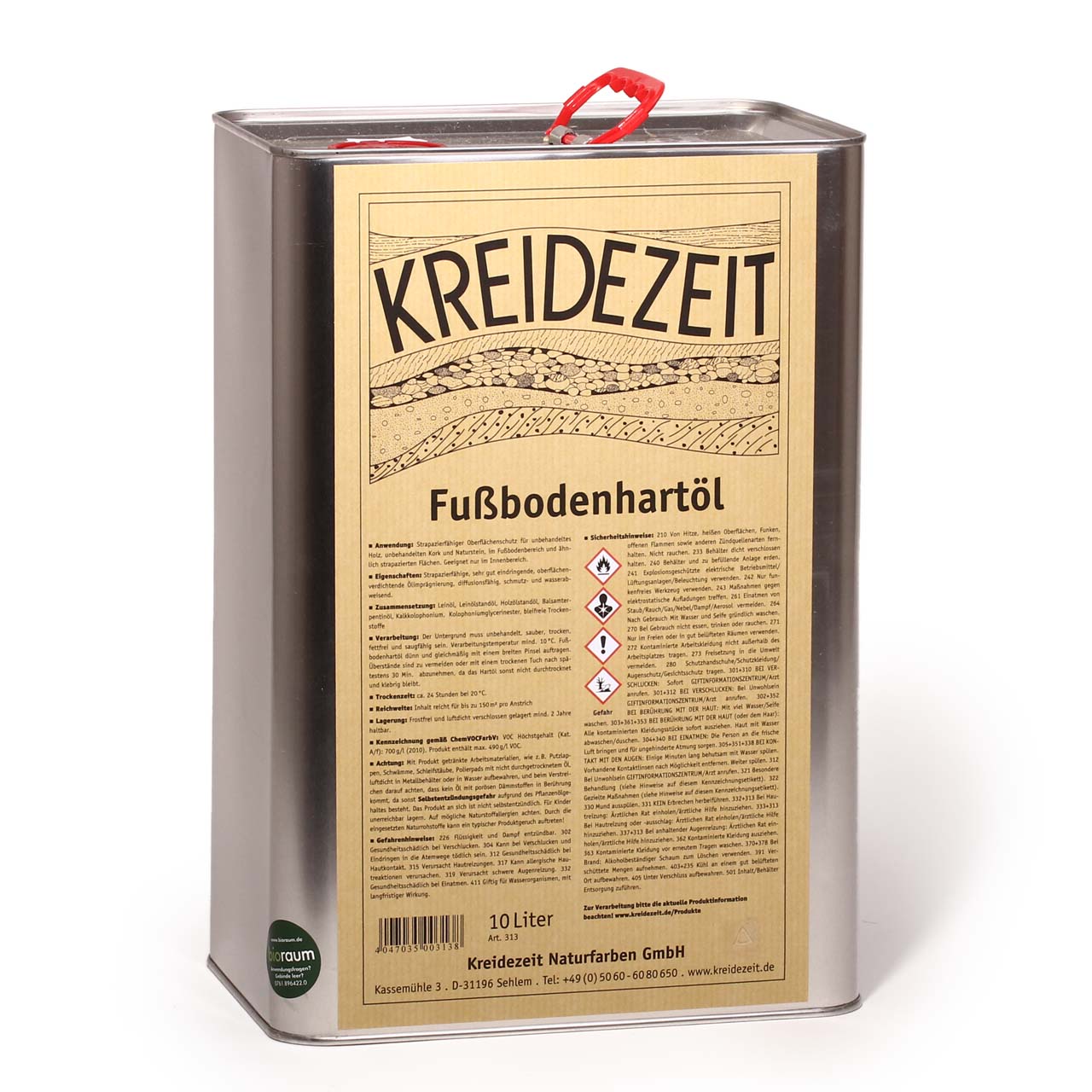 Kreidezeit Fußbodenhartöl dringt aufgrund der geringen Molekülgröße gut in den Untergrund ein, ist sehr ergiebig und und bildet eine strapazierfähige oberflächenverdichtende Imprägnierung. Es ist diffusionsfähig, schmutz- und wasserabweisend. Hergestellt aus natürlichen und nachwachsenden Rohstoffen. Es verleiht einen strapazierfähigen Oberflächenschutz für unbehandeltes Holz, unbehandelten Kork und Naturstein, im Fußbodenbereich und auf ähnlich strapazierten Flächen (Küchenarbeitsplatten, Möbel). Geeignet nur zur Verarbeitung im Innenbereich.
