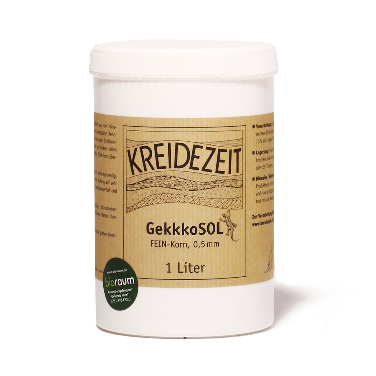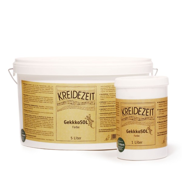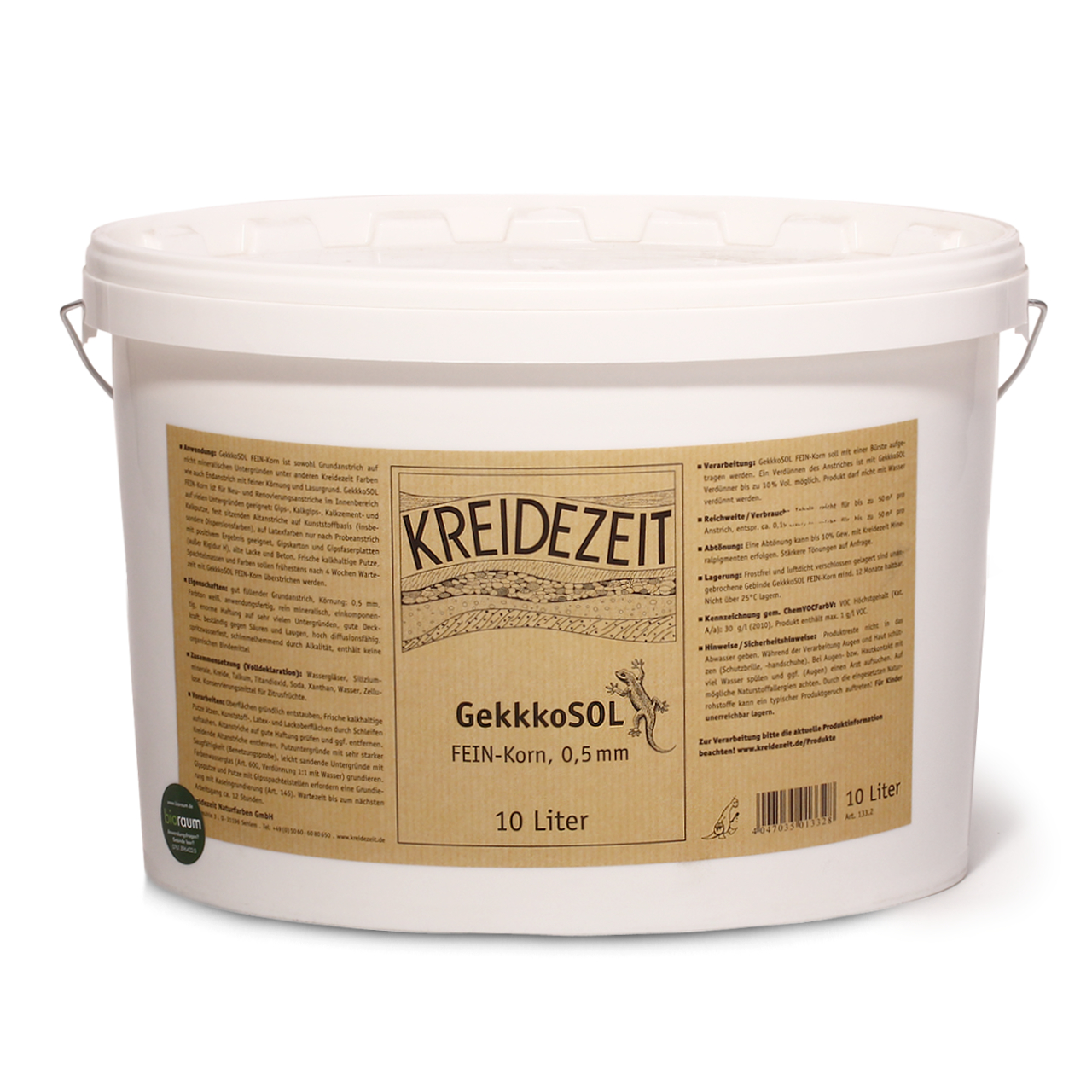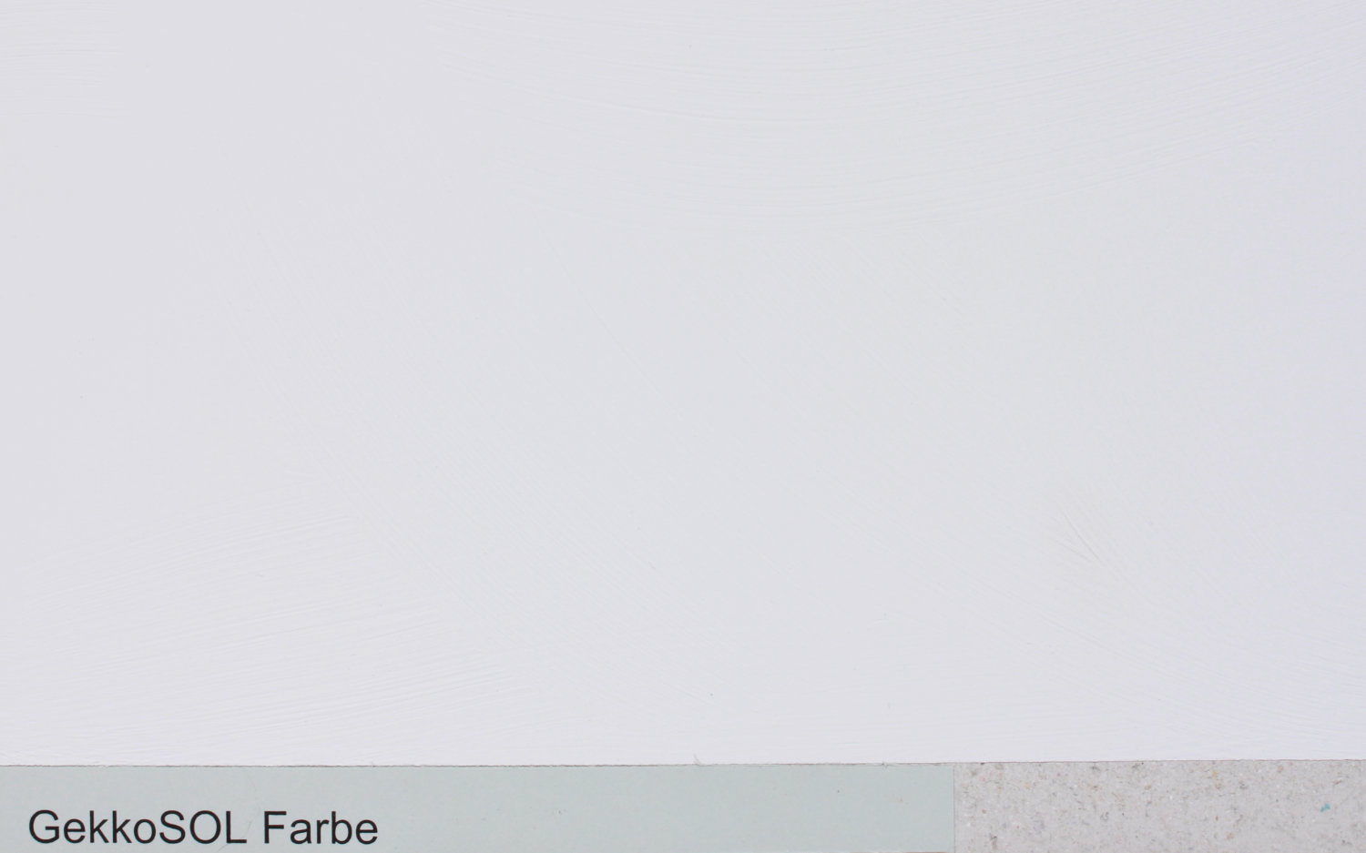 GekkkoSOL Farbe ist eine einkomponentige, weiße, ausschließlich aus rein mineralischen Füllstoffen, Pigmenten und Bindemitteln hergestellte Wandfarbe auf Silikatbasis, geeignet sowohl als Renovier-Grundbeschichtung für schwierige Untergründe als auch als edler Endanstrich. GekkkoSOL Farbe basiert auf einer neuartigen Mischung aus Wassergläsern. Eine besondere Zusammensetzung und Kombination dieser Wassergläser erzeugt ein für reine Mineralfarbe enorm breites Anwendungsspektrum.