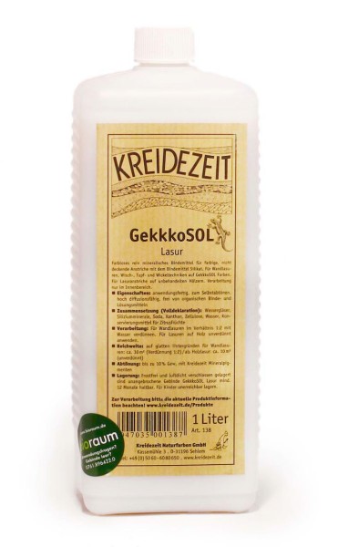 GekkkoSOL Lasur ist ein farbloses Bindemittel für farbige, nicht deckende Wandlasuren, Wisch-, Tupf- und Wickeltechniken auf GekkkoSol Farben und ein vergilbungsfreier und maximal diffusionsfähiger Lasuranstrich auf nicht strapazierten Holzoberflächen (Deckenpaneele, Gebälk). Abtönbar mit allen Kreidezeit Pigmenten.