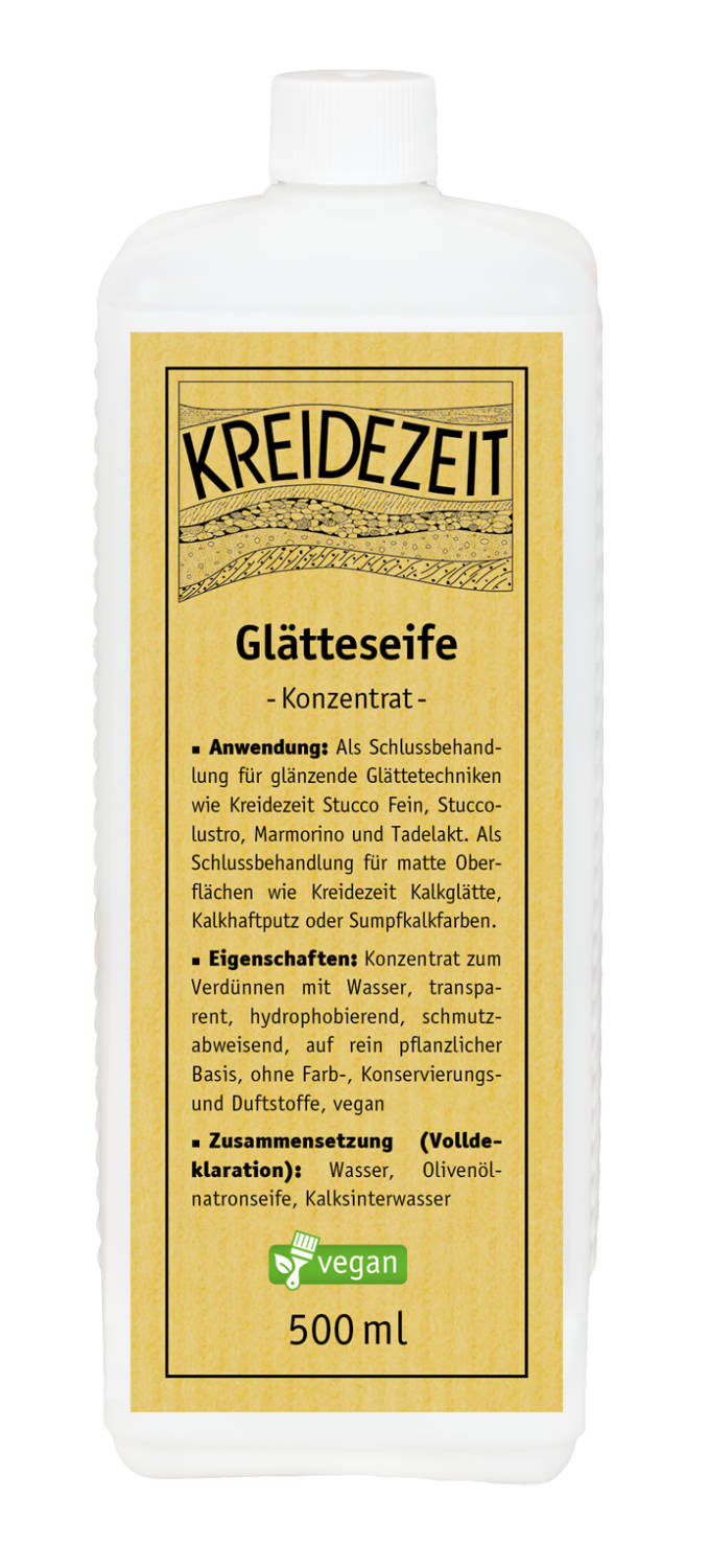 Glätteseife dient als Schlußbehandlung mit Hochglanzeffekt für Stucco -fein-, Marmorino - weiß und Tadelakt -weiß-. Sie eignet sich auch für matte Oberflächen aus Kalkglätte, Kalkhaftputz oder Sumpfkalkfarbe. Helle und dunkle Oberflächen können gleichermaßen mit dem Glätteseife-Konzentrat behandelt werden.