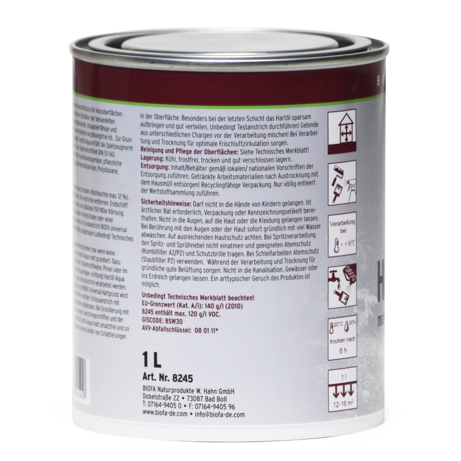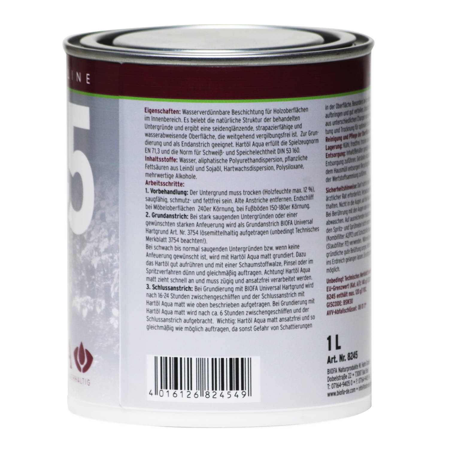 Das Biofa Hartöl Aqua ist eine wasserverdünnbare Beschichtung für Holzoberflächen im Innenbereich. Es belebt die natürliche Struktur des Holzes und ergibt eine matte, strapazierfähige, schmutz- und wasserabweisende Oberfläche, die weitgehend vergilbungsfrei ist. Zur rationellen, zeitsparenden Oberflächenbehandlung von Holzböden, Innenausbau sowie Innen- und Außenflächen von Möbeln. Es eignet sich als Grundierung und als Endanstrich. Das Hartöl Aqua 8245 erfüllt die Spelzeugnorm EN 71, Teil 3 sowie die DIN 53160 (Schweiß- und Speichelechtheit).