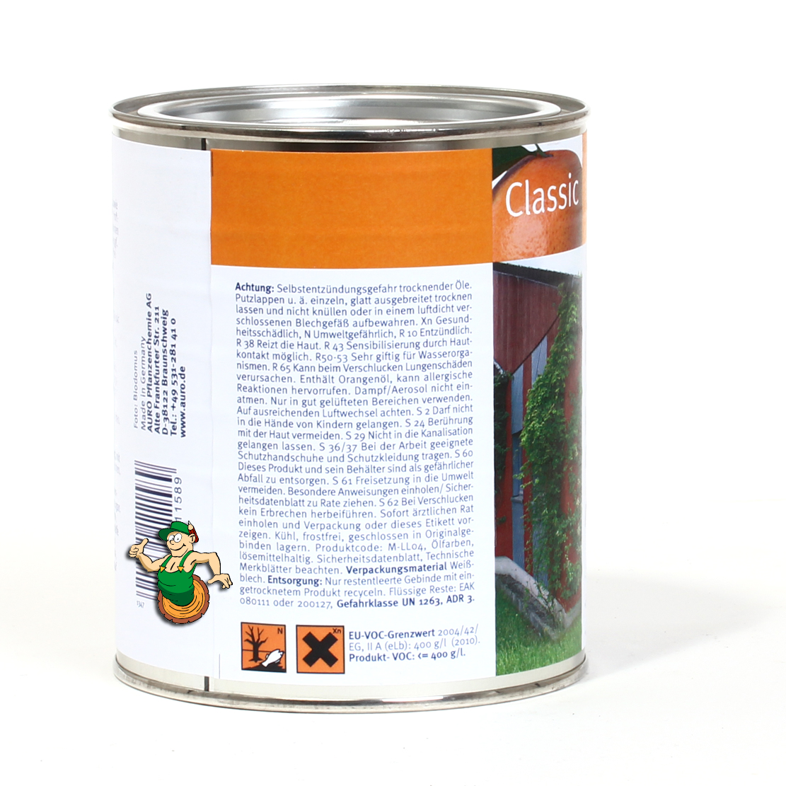 Die seidenglänzende Holzlasur Classic Nr. 930 wird für farbige und farblose lasierende Anstriche auf Holzoberflächen verwendet. Die Farbtöne sind in jedem Verhältnis untereinander mischbar.Wegen des fehlenden UV-Schutzes ist die farblose Lasur nicht für Außenanstriche geeignet. Mischungen farbiger Lasuren mit farblos mindern deren Außenbeständigkeit und verkürzen die Renovierungszyklen. Je nach verwendeter Holzart können Farbabweichungen auftreten. Unterschiedliche Chargennummern vor der Verarbeitung ggf. mischen. Vor großflächiger Verarbeitung empfehlen wir Probeflächen anzulegen. Bitte Technisches Merkblatt beachten.