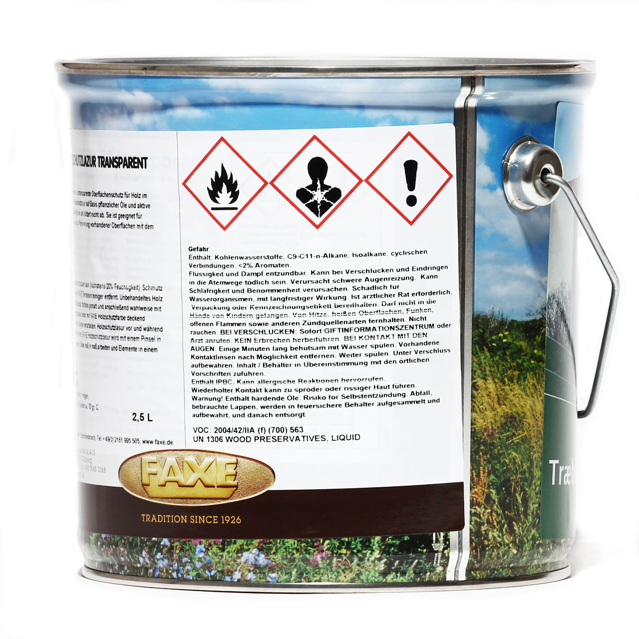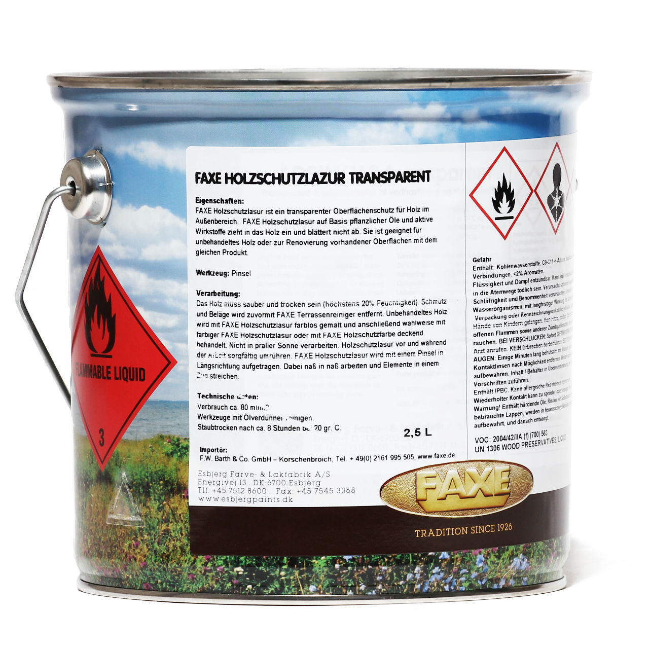 Die FAXE Holzschutzlasur ist gesundheitsschädlich und kann beim Verschlucken Lungenschäden verursachen. Auch Berührungen mit der Haut sollten vermieden werden, da wiederholter Kontakt zu spröder und rissiger Haut führen kann. Darüber hinaus sollte stets darauf geachtet werden, dass das Produkt weder in die Hände von Kindern, noch in die Kanalisation gelangen kann, da es giftig für Wasserorganismen ist und in Gewässern längerfristig zu schädlichen Wirkungen führen kann.