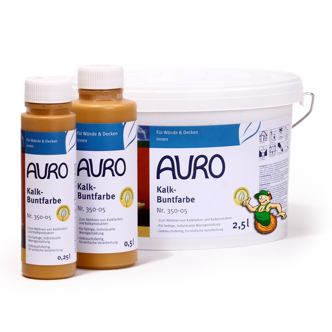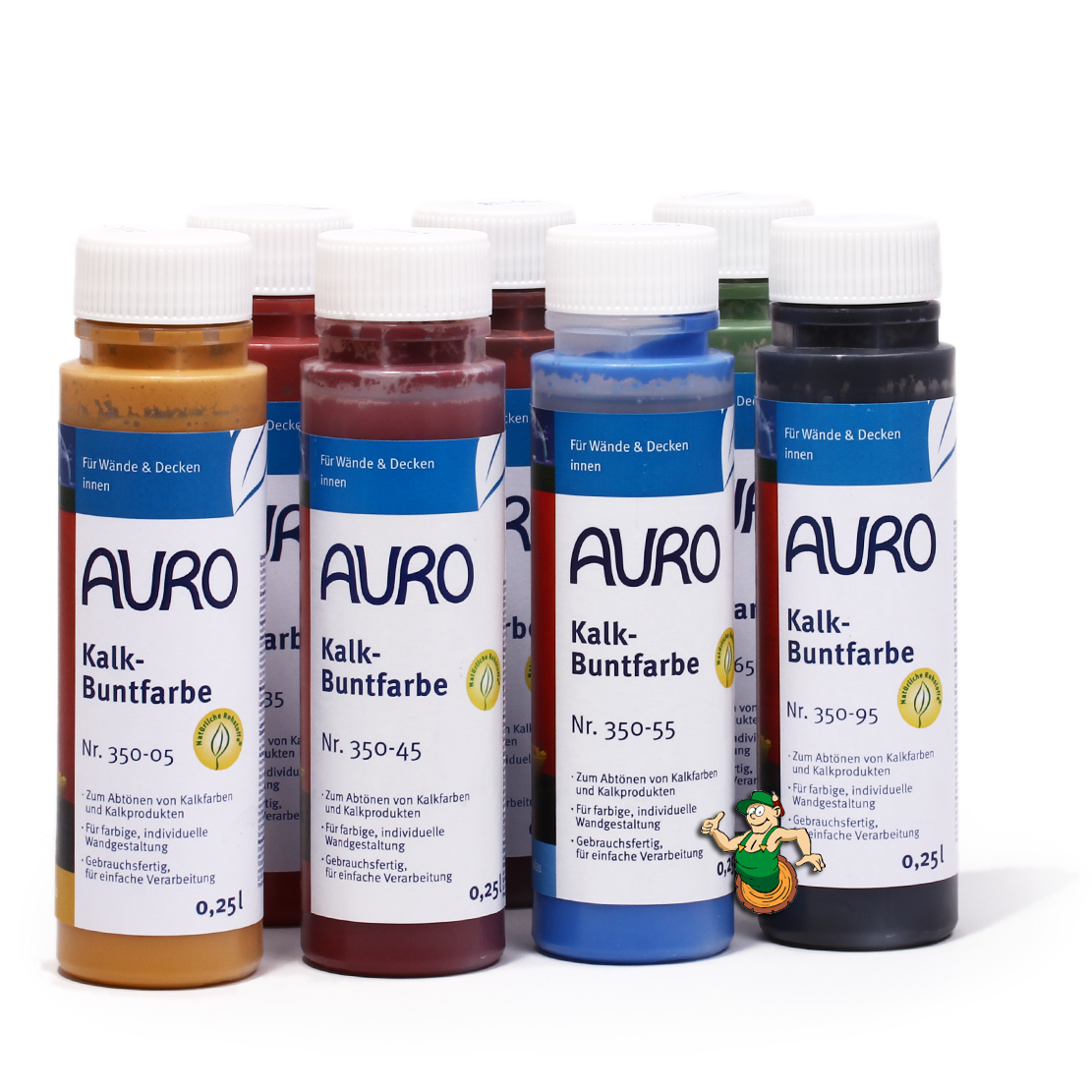 Natürlich und bunt - das sind zwei wichtige Eigenschaften der AURO Kalk-Buntfarbe 350. Die farbige Version der Kalkfarbe ist sowohl pur als Volltonfarbe streichbar, als auch zur Abtönung der meisten AURO Kalkprodukte verwendbar. Bei Profi-Kalkspachtel Nr. 342, Profi-Kalkfeinputz Nr. 345, Profi-Kalkputz Nr. 347, Anti-Schimmelfarbe Nr. 327, Kalkcasein-Wandfarbe Nr. 751 und Frischeweiß Nr. 328 muss ggf. mit der Beeinflussung von deren spezifischen Eigenschaften gerechnet werden, wenn erhebliche Mengen beigemischt werden.