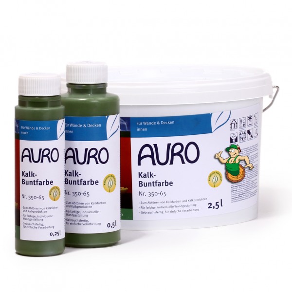 Natürlich und bunt - das sind zwei wichtige Eigenschaften der AURO Kalk-Buntfarbe 350. Die farbige Version der Kalkfarbe ist sowohl pur als Volltonfarbe streichbar, als auch zur Abtönung der meisten AURO Kalkprodukte verwendbar. Beim Profi-Kalkfeinputz Nr. 345, Profi-Kalkputz Nr. 347, Anti-Schimmelfarbe Nr. 327, Kalkcasein-Wandfarbe Nr. 751 und Frischeweiß Nr. 328 muss ggf. mit der Beeinflussung von deren spezifischen Eigenschaften gerechnet werden, wenn erhebliche Mengen beigemischt werden.