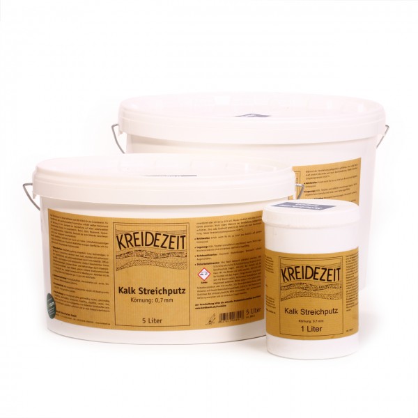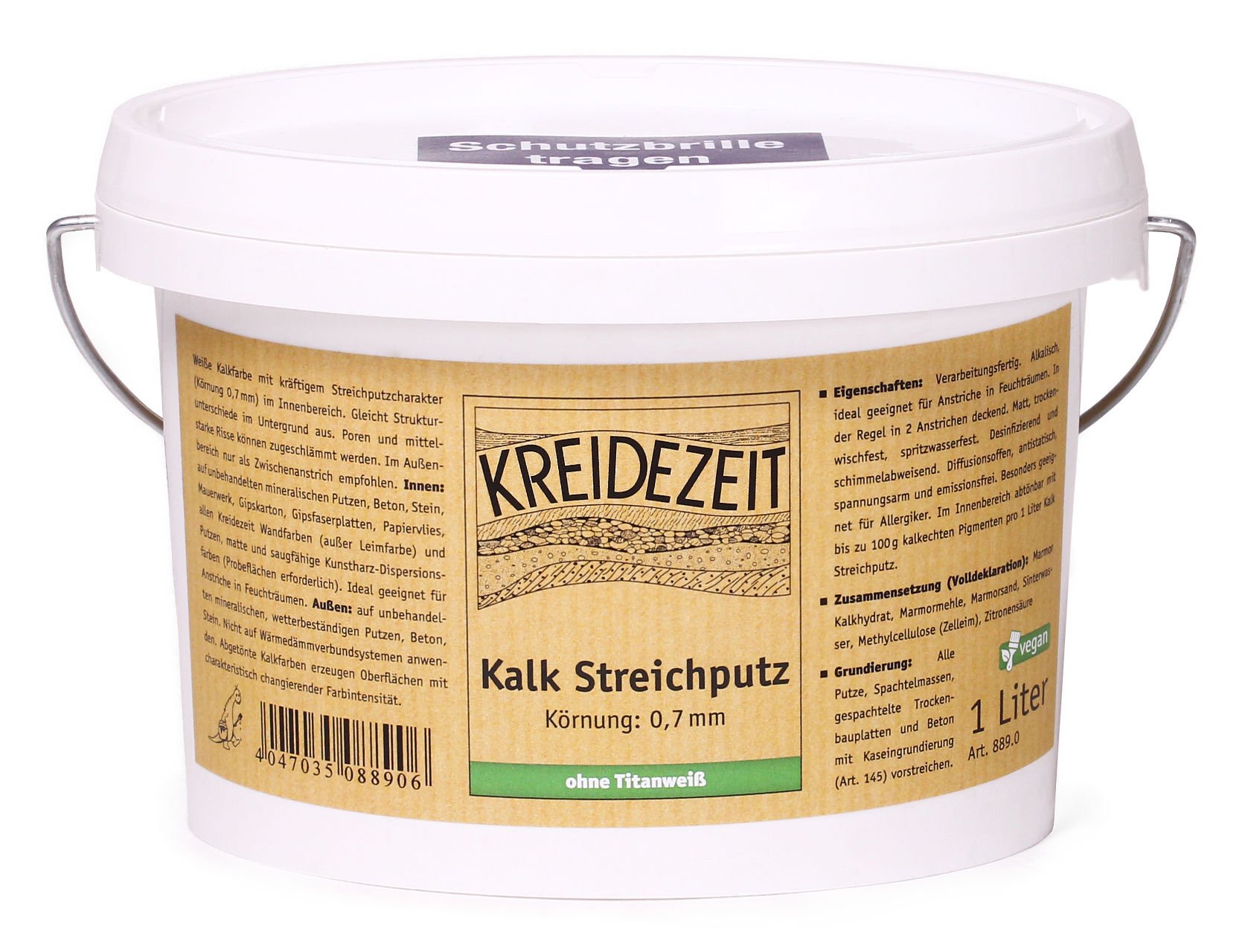 KREIDEZEIT Kalk Streichputz bekommt durch ein besonderes Herstellungsverfahren, eine harte und wischfeste Oberfläche ohne Zusatz von Kunstharzbindemitteln, so daß Kalk Streichputz auch auf für Kalkfarben normalerweise ungeeigneten Untergründen zuverlässig haftet. Kalk Streichputz ist angereichert mit Marmormehlen und Marmorsanden und ist dadurch in der Regel in 2 Anstrichen deckend. Der Kalk Streichputz ist aufgrund seiner hohen Alkalität (pH 13) und der hohen Diffusionsfähigkeit ideal geeignet auch für Anstriche in Feuchträumen.