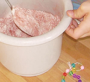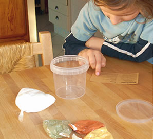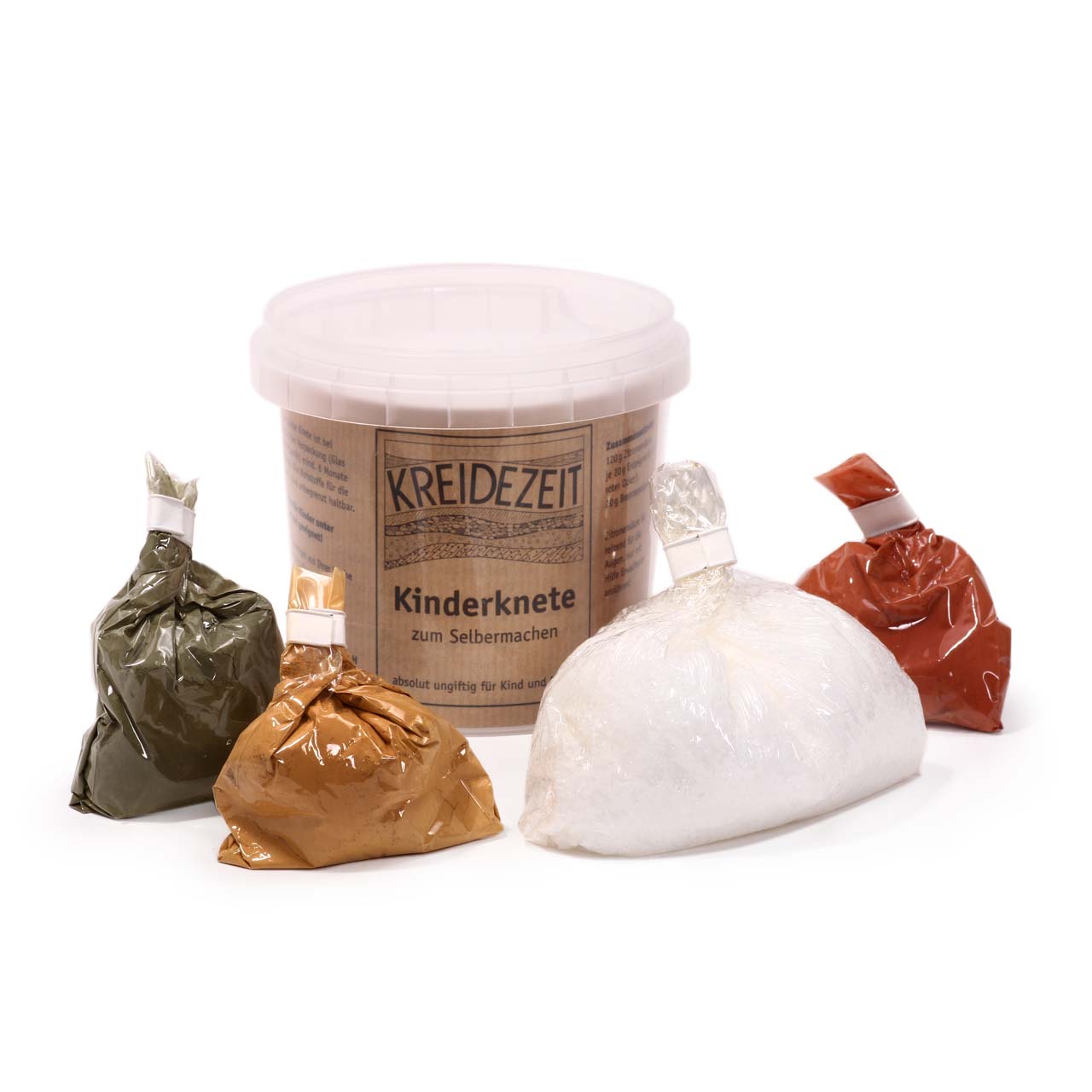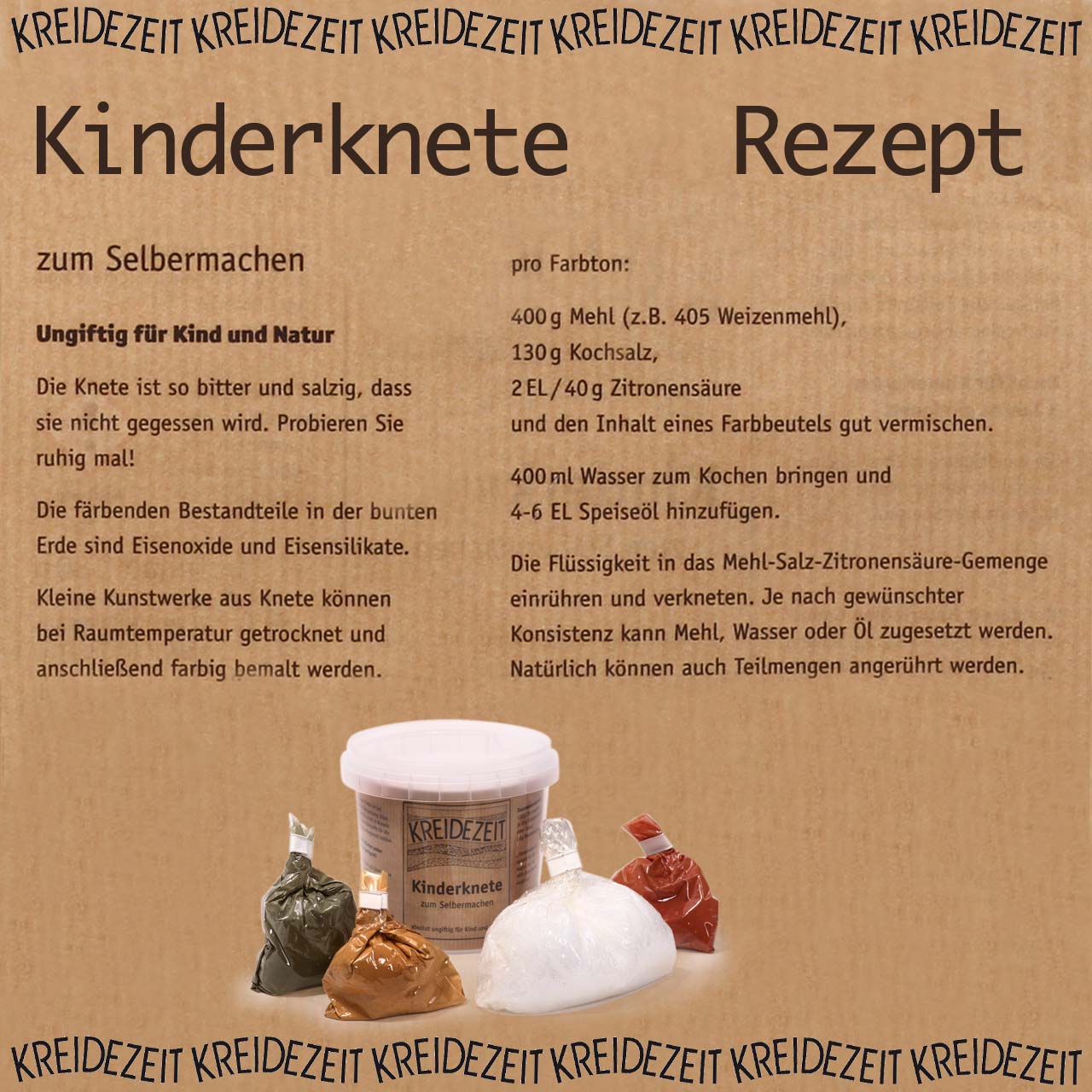 Die Kinderknete ist so bitter und salzig, dass sie nicht gegessen wird. Probieren Sie ruhig mal! Die färbenden Eigenschaften in der bunten Erde sind Eisenoxide und Eisensilikat. Kleine Kunstwerke aus Knete können bei Raumtemperatur getrocknet und anschließend bemalt werden. Angerührte Knete ist bei luftdichter Verpackung (Glas oder Plastik) mind. 6 Monate haltbar. Die Rohstoffe für die Knete sind unbegrenzt haltbar. Nicht für Kinder unter 3 Jahren geeignet!