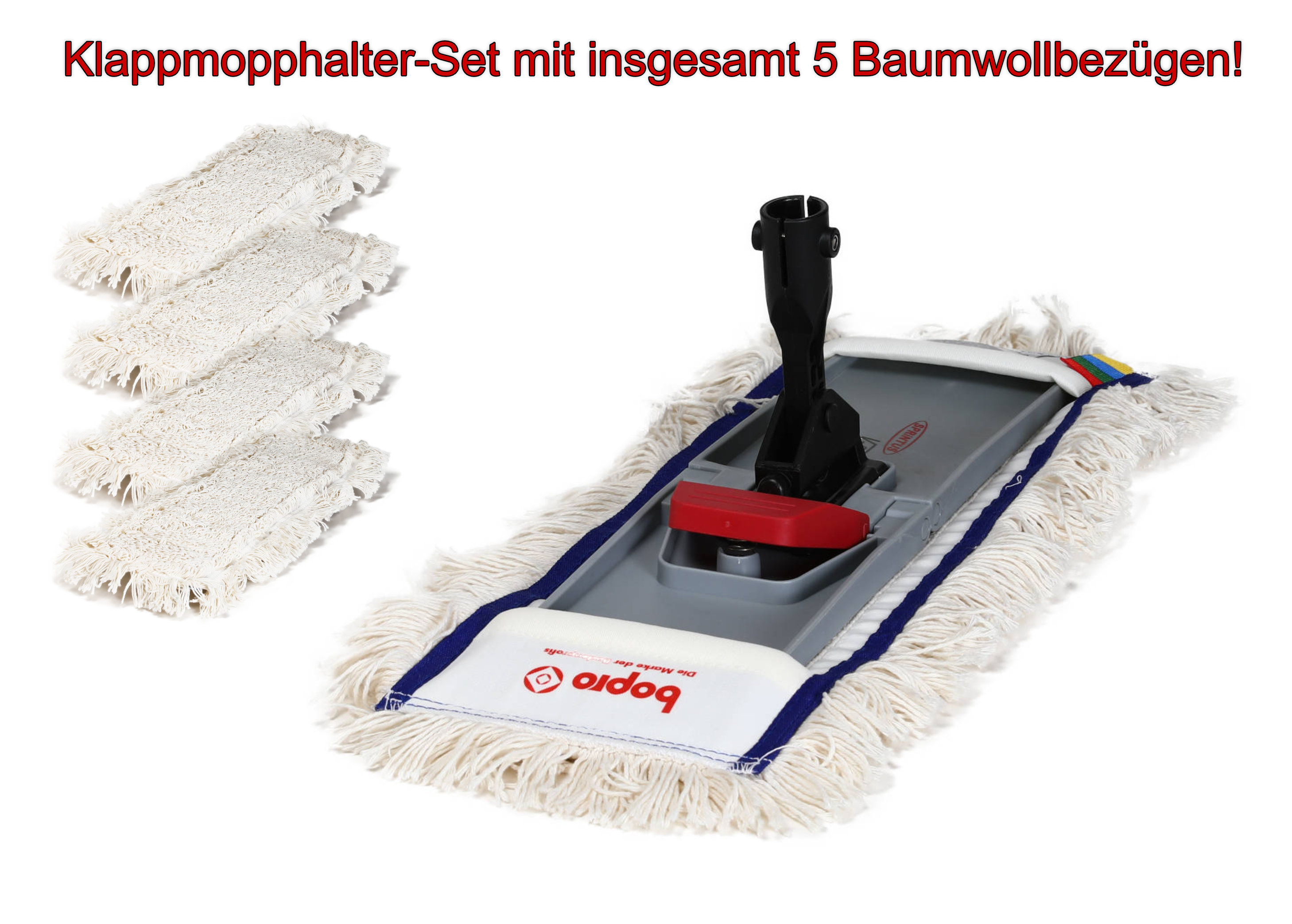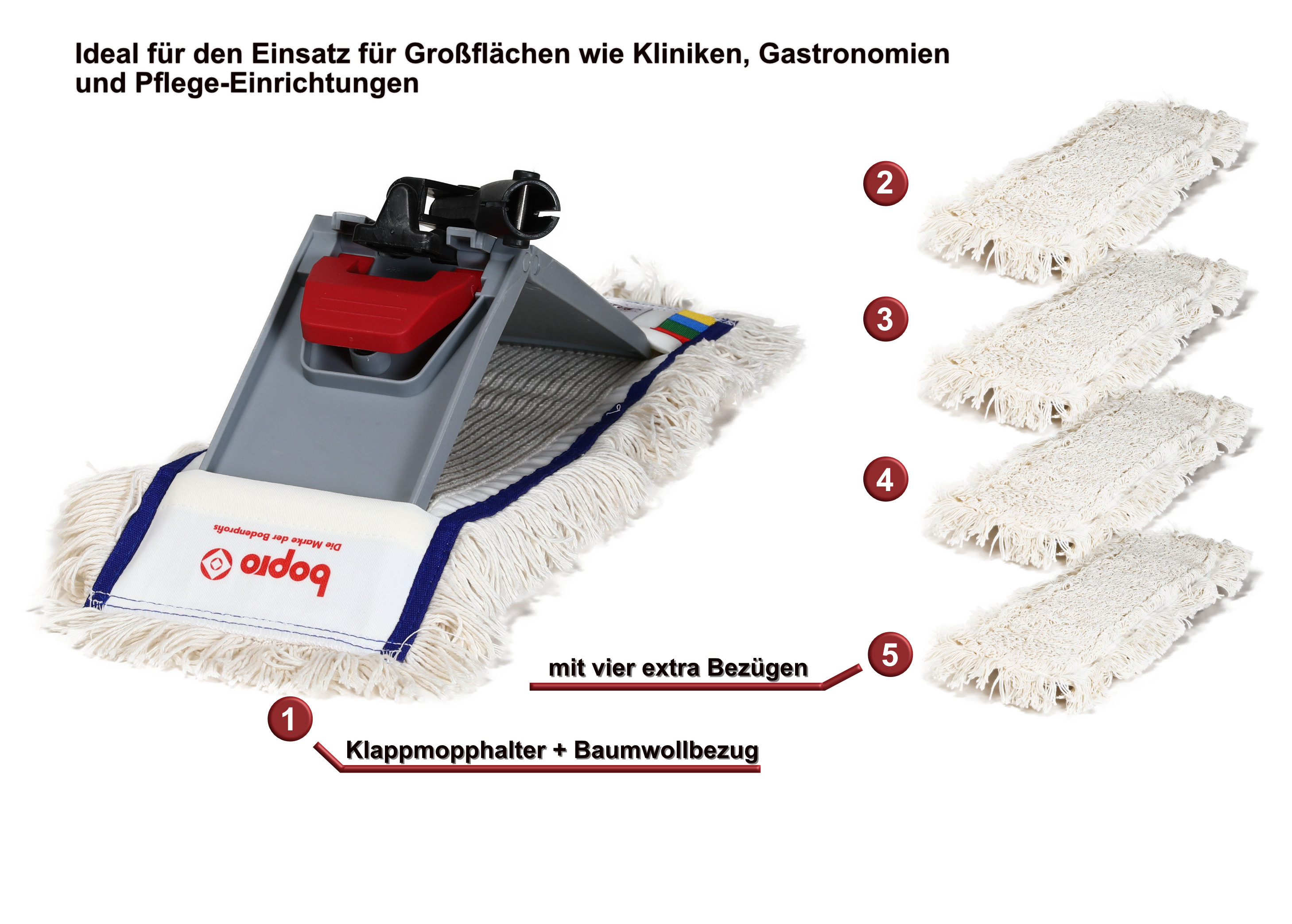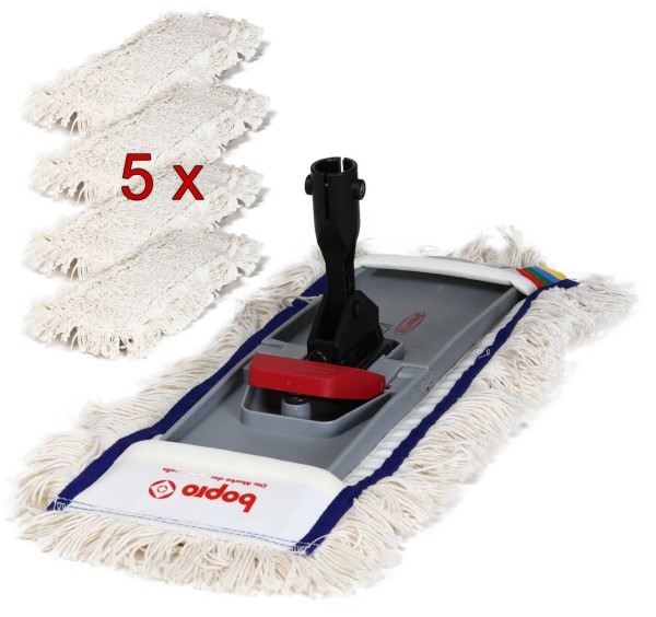 Entdecken Sie das ultimative Wischmopp-Set für eine effiziente und gründliche Reinigung Ihrer Böden. Dieses Set wurde speziell für die Pflege großer Flächen konzipiert und bietet ein langes und zufriedenstellendes Wischerlebnis. Mit den fünf hochwertigen Baumwollbezügen von bopro und einem praktischen Klapphalter ausgestattet, ist dieses Set die ideale Lösung für die Reinigung und Pflege von Holzböden sowie anderen harten Bodenbelägen. Die Baumwollbezüge, die jeweils ca. 50 x 10 cm messen, sind speziell dafür entworfen, sowohl geölte als auch lackierte Holz- und Steinböden sorgfältig zu reinigen. Sie entfernen effektiv Schmutz und Staub, ohne die Oberflächen zu beschädigen. Ihre extreme Langlebigkeit macht sie zur optimalen Wahl für den Einsatz in Pflegeeinrichtungen, Kliniken und anderen professionellen Umgebungen, in denen Hygiene und Sauberkeit oberste Priorität haben.