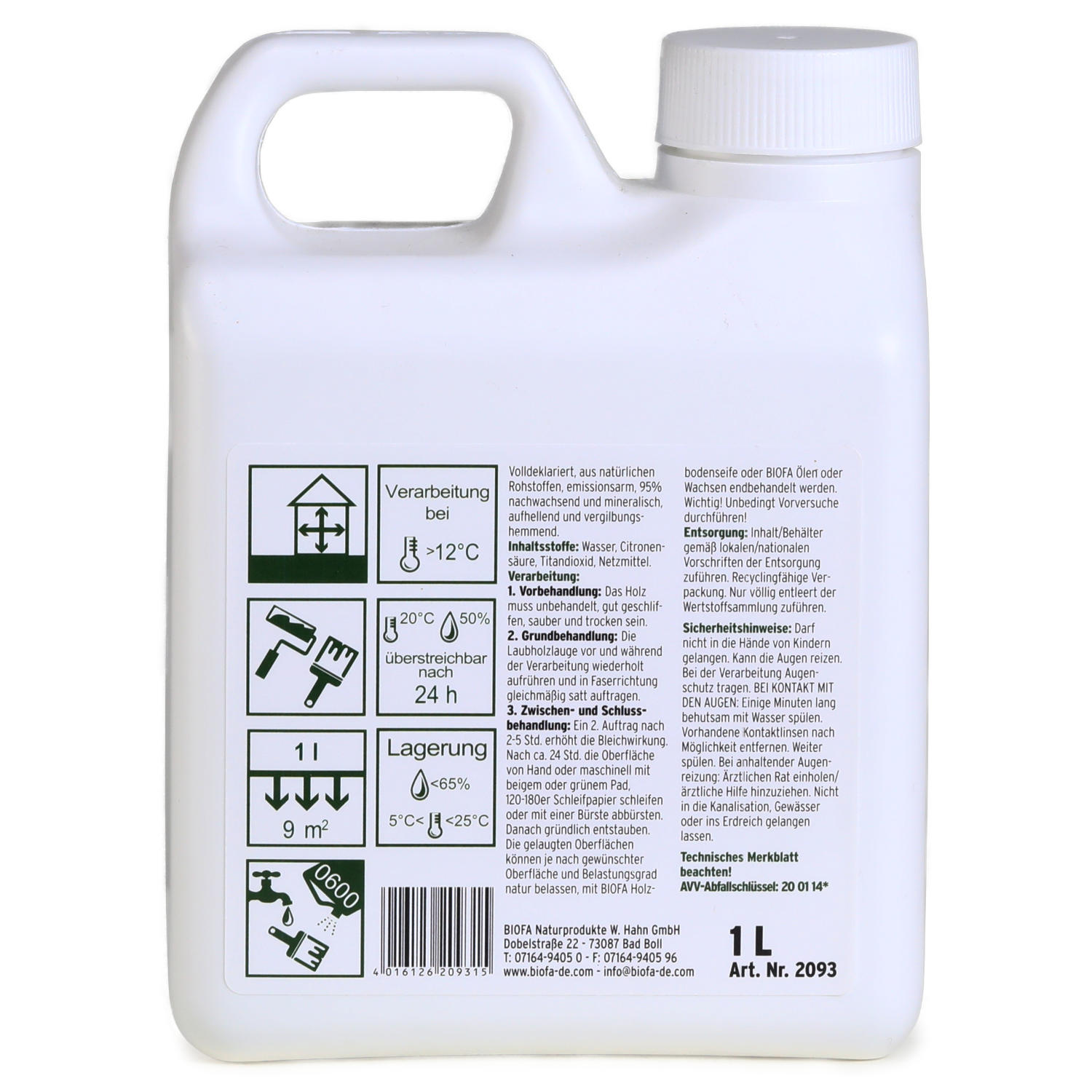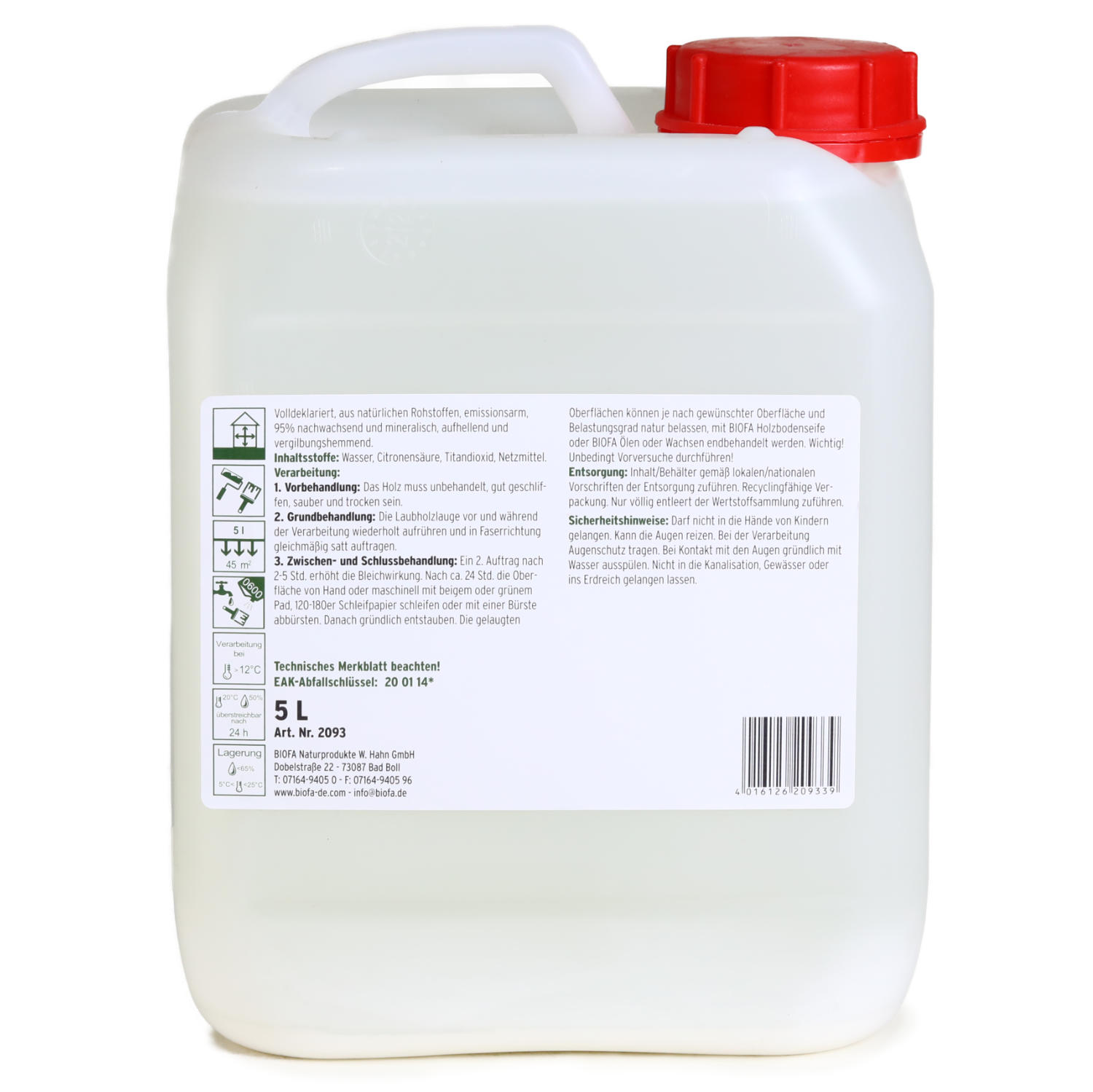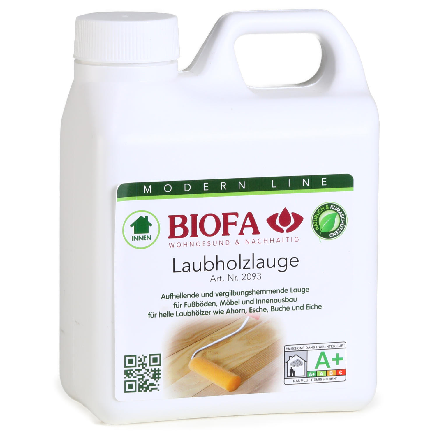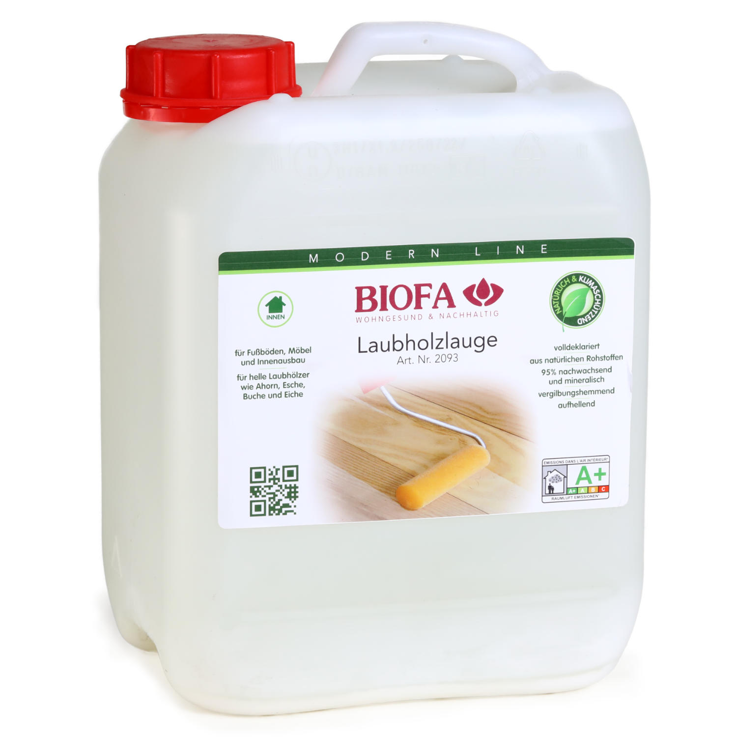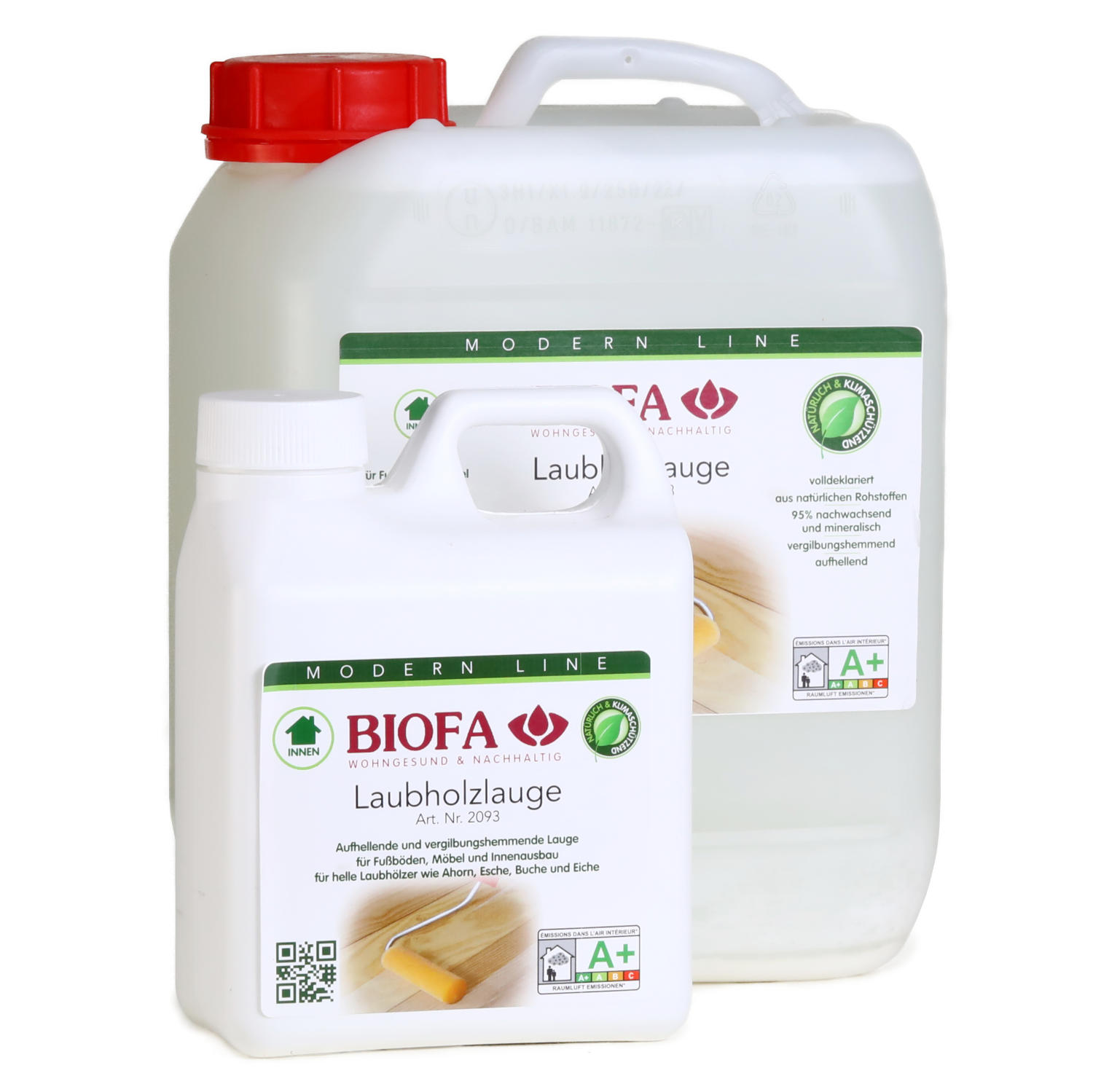 BIOFA Laubholzlauge ist ein gebrauchsfertiges Produkt für helle Laubhölzer wie Ahorn, Esche, Buche, Eiche, usw. Auch für Nadelhölzer, die aufgehellt werden sollen, geeignet. Der Vergilbungsprozess des Holzes wird weitgehend aufgehalten und somit das helle Aussehen der Oberflächen bewahrt. Eine Nachbehandlung mit BIOFA Holzbodenseife weiß 2092 verleiht der Oberfläche einen weißgescheuerten Charakter. Eine Nachbehandlung mit BIOFA Holzbodenseife natur 2091 oder BIOFA Hartwachs 2060 erhält nahezu das ursprüngliche Aussehen des Holzes. Für Fußböden, Wände, Decken, Türen, Möbel, etc.