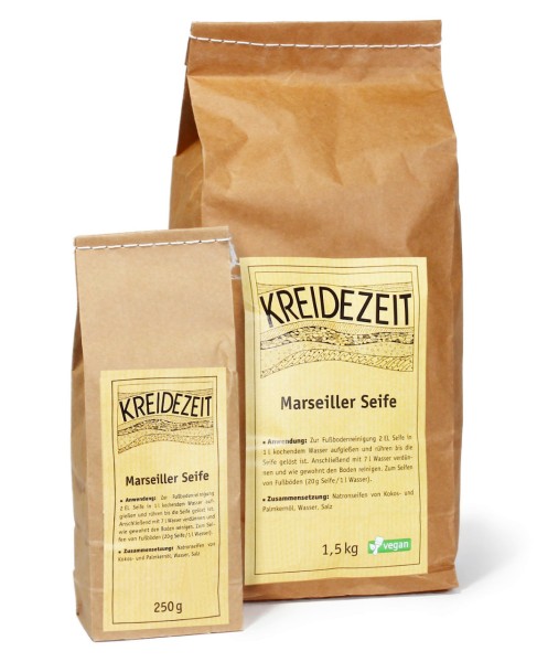 Für eine Seifen-Grundbehandlung löst man je 20g Seife mit 1L kochendem Wasser, d.h. aus 250g Marseiller Seife erhält man 12,5L Seifenlösung. Die trägt man am besten noch warm auf den Boden auf und schrubbt sie ein. Nach Trocknung wird diese Behandlung mehrfach wiederholt. Pro Auftrag seift man mit einem Liter ca. 8-12qm Holz. Alle Detailinfos finden sich auch im Technischen Merkblatt unten auf der Produktseite zum Download.