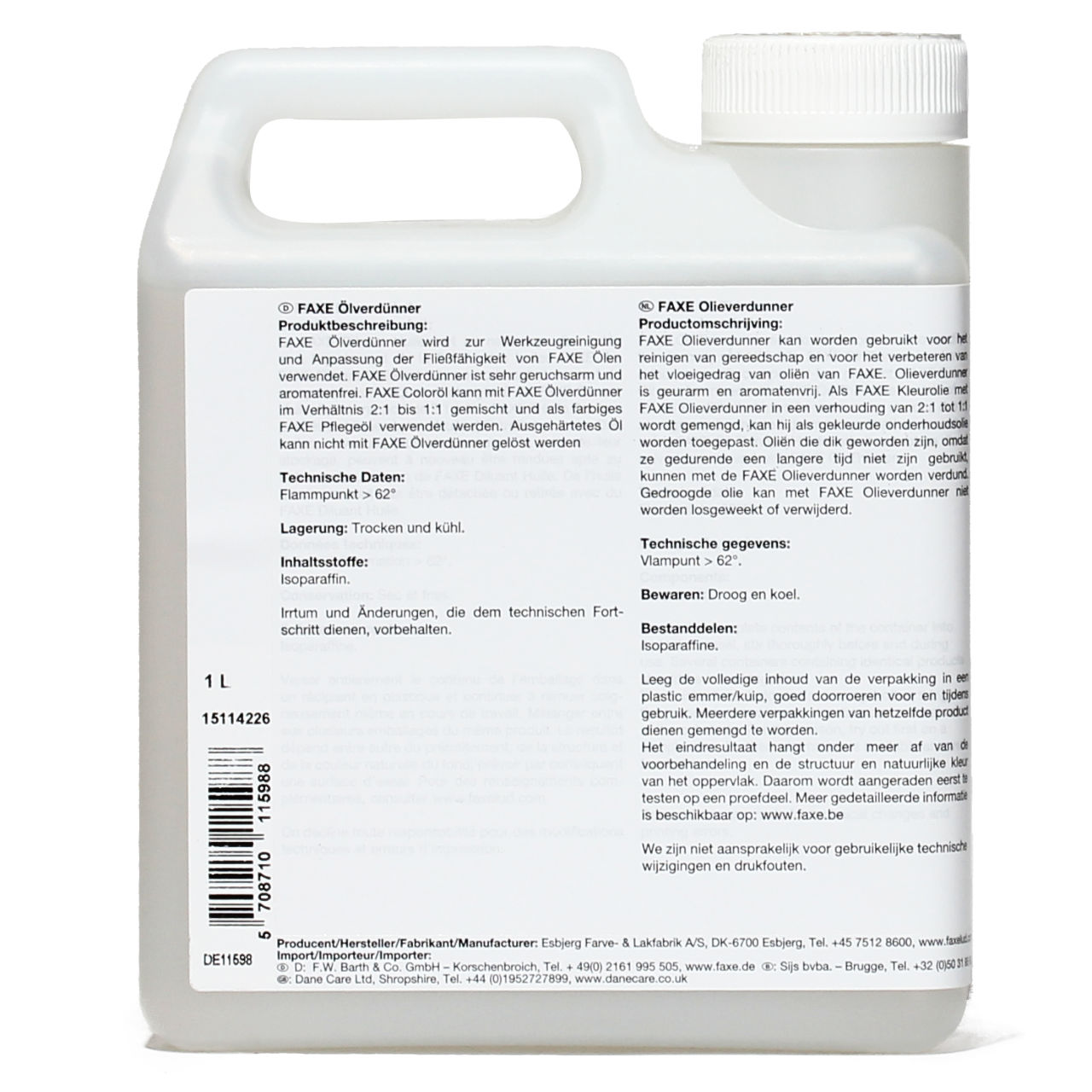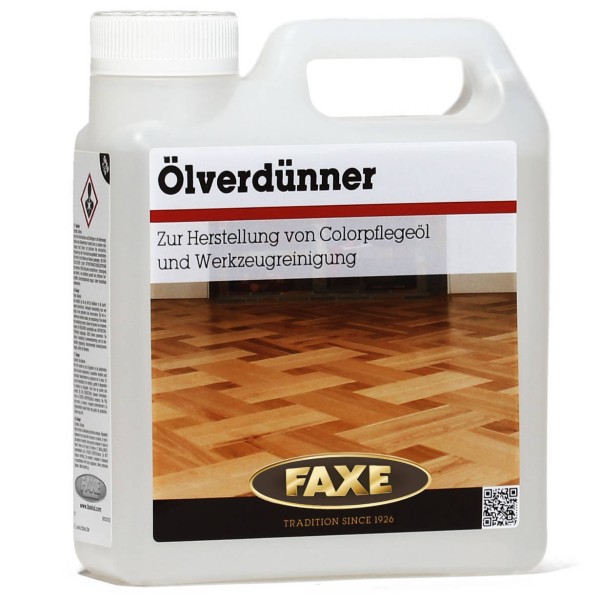 Öle, die durch Lagerung dickflüssiger geworden sind, können mit dem Faxe Ölverdünner wieder verarbeitungsfähig gemacht werden. Außerdem kann Faxe Coloröl mit Faxe Ölverdünner im Verhältnis 2:1 bis 1:1 gemischt, als coloriertes Pflegeöl verwendet werden.