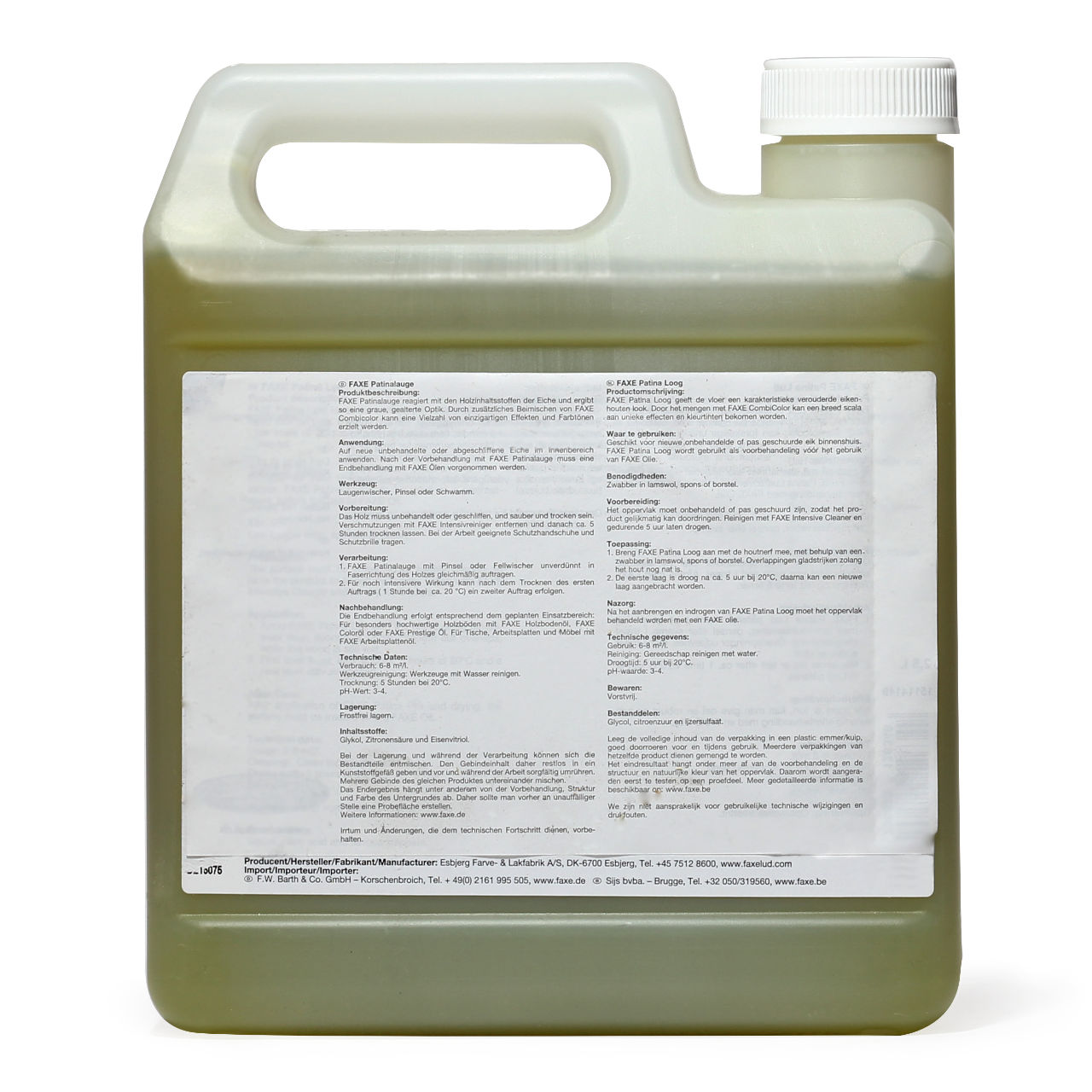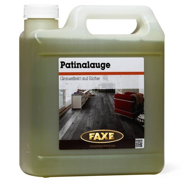 Die Patinalauge von FAXE stoppt Vergilbungsprozesse und erzeugt bei unbehandelter Eiche eine für altes Holz typische Farbänderung. Die Lauge reagiert mit der in der Eiche enthaltenen Gerbsäure und lässt so eine graue und gealtert wirkende, eben "patinierte" Optik entstehen.