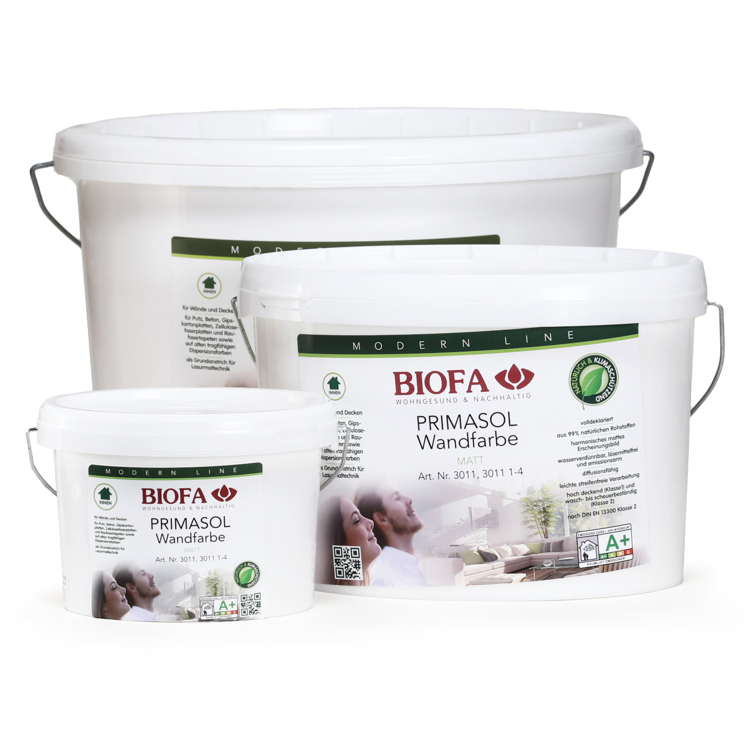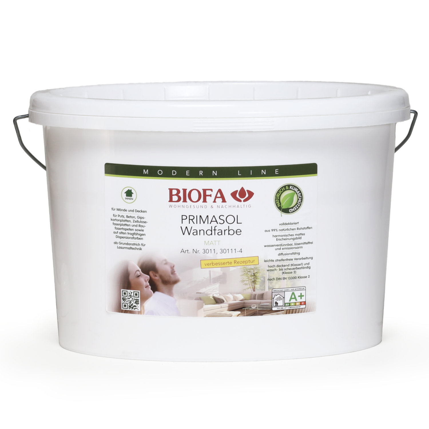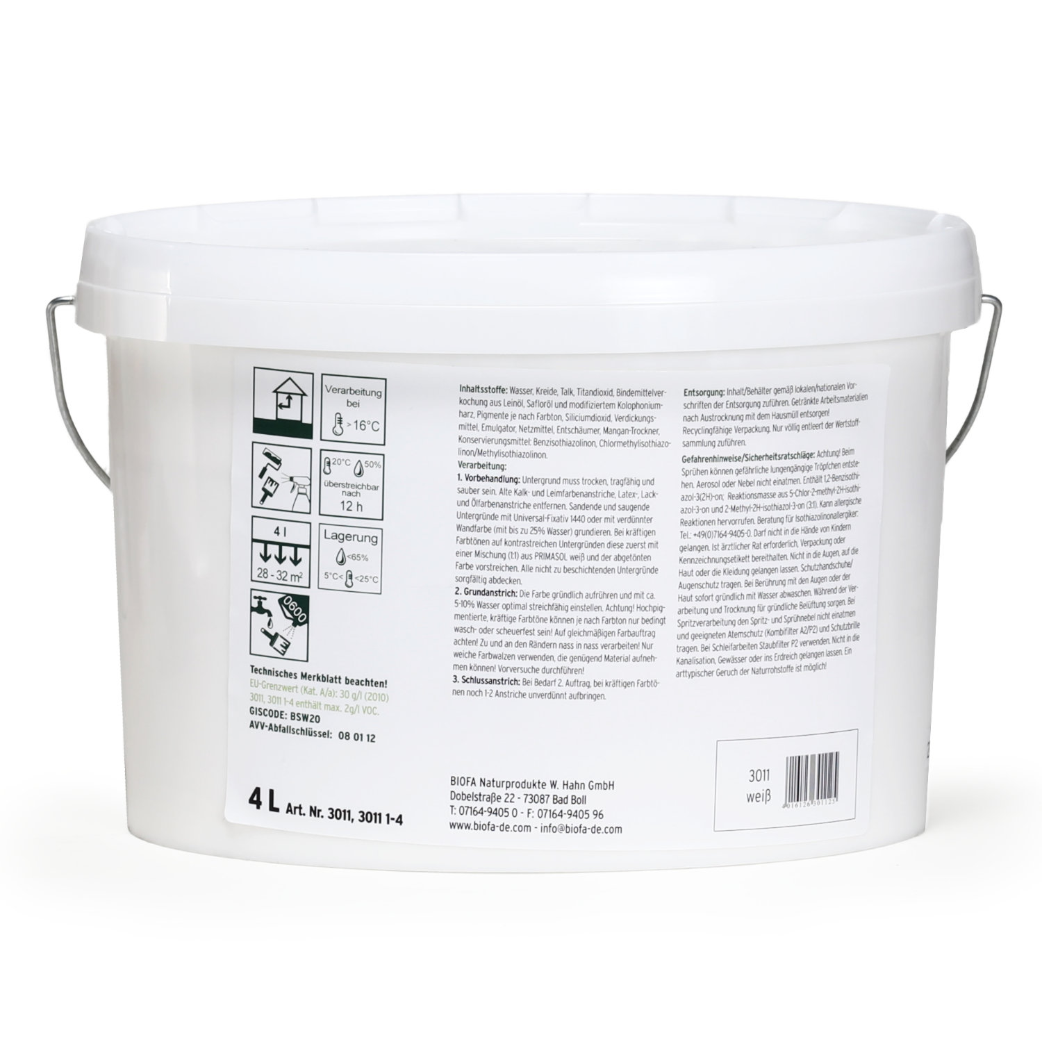 Lösemittelfreie, wasserverdünnbare Wandfarbe aus natürlichen Rohstoffen. Der Anstrich ist matt, hochdeckend, schnelltrocknend, diffusionsfähig, atmungsaktiv und wasch- bis scheuerbeständig. Für tragfähige Untergründe im Innenbereich wie Putz, Beton, Gasbeton, Gipskartonplatten, Zellulosefaserplatten, Raufasertapeten. Auch zur Renovierung alter Dispersionsfarben, die tragfähig und sauber sind. Als Grundanstrich für Lasurmaltechnik mit BIOFA Wandlasuren.