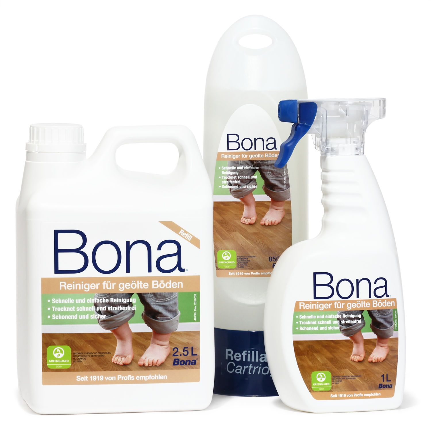 Er ist sanft zum empfindlichen Holz, aber stark zum Schmutz: Der Bona Reiniger für geölte Böden, der in drei Varianten erhältlich ist: Als praktische 1-Liter-Sprühflasche, als Kartusche (0,75 Liter) für den Bona Spray Mop und als preisgünstiger 2,5-Liter-Nachfüllkanister.