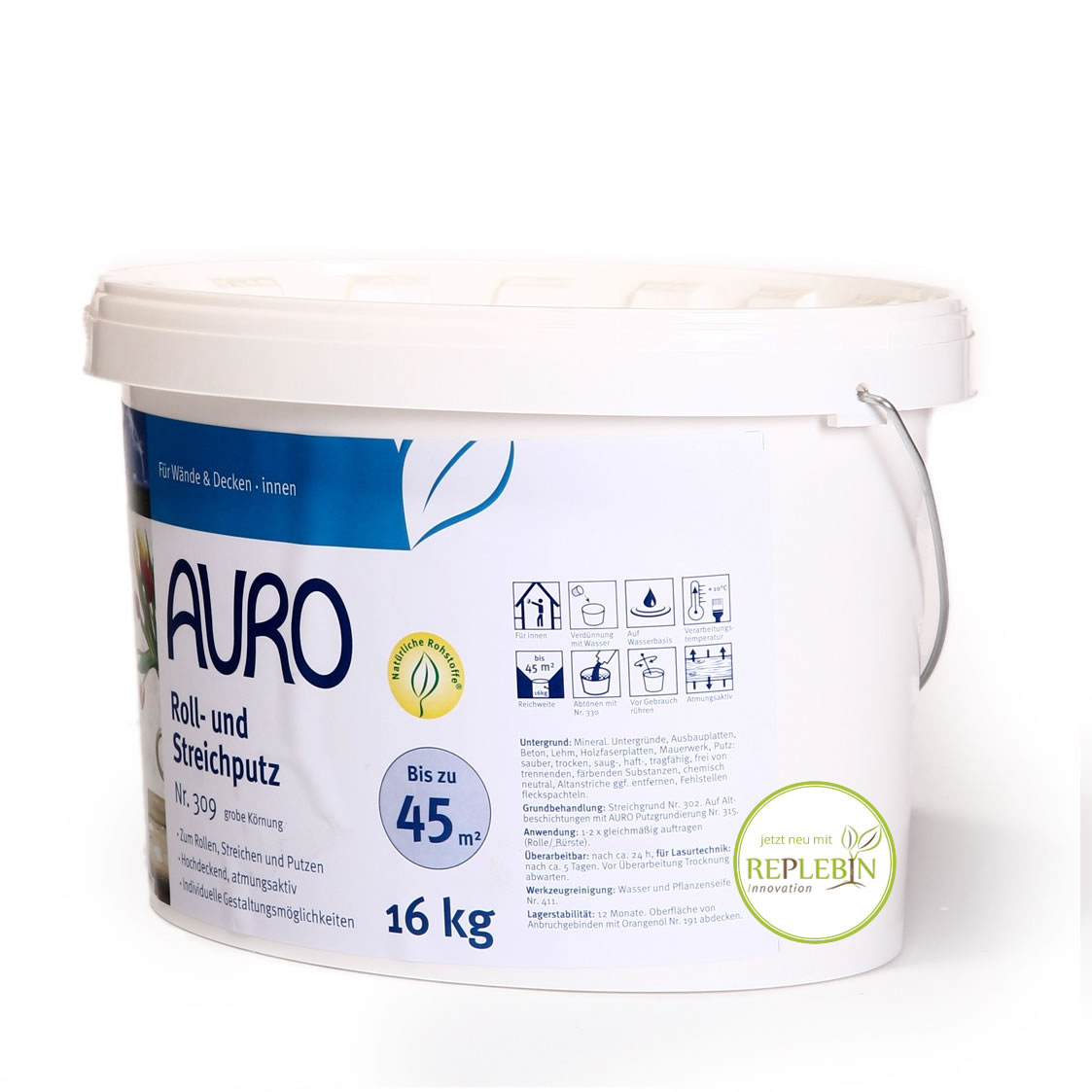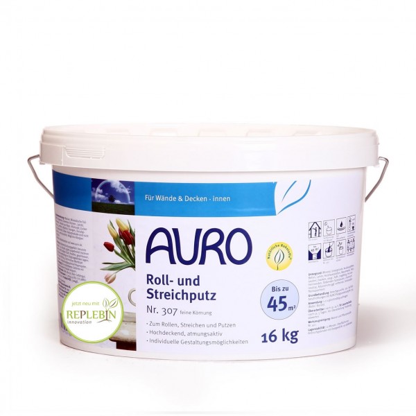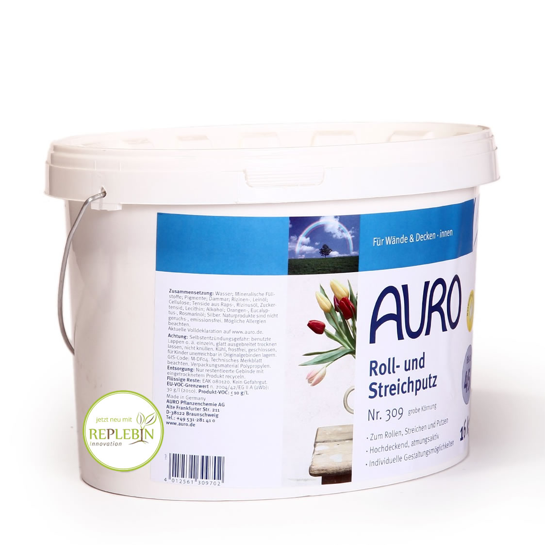 Strukturgebende, matt weiße Putz-Beschichtung mit feiner Körnung (ca.0,5 mm) für Wand- und Deckenflächen. Dieser Putz ist offenporig, gut deckend und sehr einfach zu verarbeiten. Kann farbig abgetönt werden mit AURO Vollton- und Abtönfarbe Nr. 330 (z.B. Vollton- und Abtönfarbe Nr. 330, max. 5 %) oder lasiert werden mit AURO Wandlasur-Pflanzenfarbe Nr. 360 - etwa der Wandlasur Pflanzenfarbe Nr.-360. Jetzt mit neuer Rezeptur: Das biogene Bindemittel REPLEBIN® - emissionsfrei und mit Profi-Produkteigenschaften. Bessere Untergrundverträglichkeit und Haftung, ölfrei, dauerhaft weiß und mit besserem Pigmentbindevermögen.