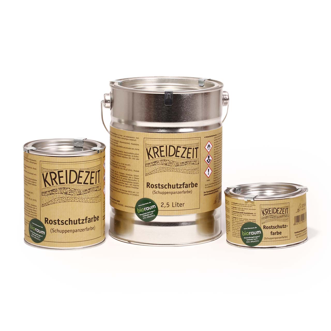In der Kreidezeit Rostschutzfarbe ist in großer Menge Eisenglimmer enthalten. Eisenglimmer ist ein natürlich vorkommendes schwarzglänzendes Pigment. Weiterhin hat es eine ausgeprägte Schuppenstruktur. Es bildet einen schützenden "Panzer", der das Eindringen von Wasser stark erschwert. In älteren Malbüchern ist daher auch oft die Rede von: "Schuppenpanzerfarbe". Ein weiterer Vorteil der Rostschutzfarbe ist der hervorragende Schutz vor UV-Strahlung. Das in der Rostschutzfarbe enthaltene Leinöl garantiert eine sehr gute Benetzung des Untergrundes. Die Rostschutzwirkung wurde sogar in Tests bestätigt. So ist unsere Rostschutzfarbe Testsieger von 33 Rostschutzfarben, unter denen auch synthetische Farben dabei waren. (ARD Ratgeber Technik, März 1999)
