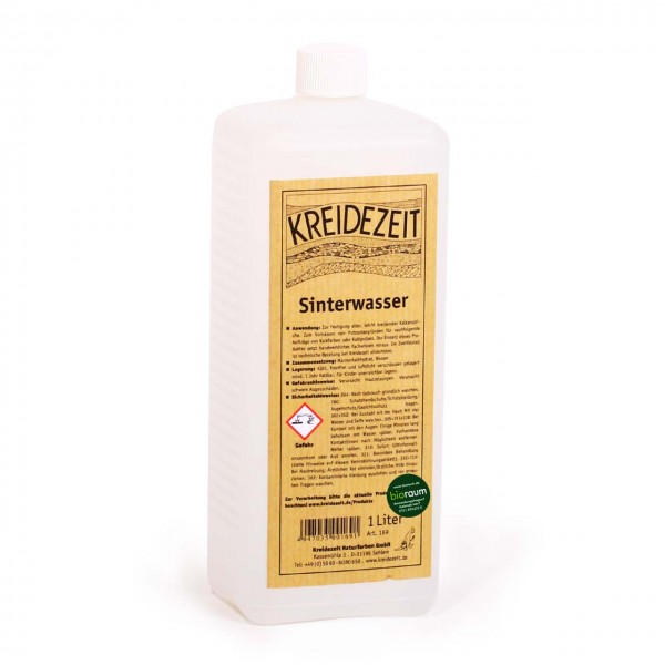 Unser Kreidezeit Sinterwasser ist eine gesättigte anwendungsfertige Sumpfkalklösung ohne synthetische Bindemittelzusätze. Das Sinterwasser eignet sich hervorragend als Festigungsmittel bei saugenden und sandenden Untergründen. Weiterhin ist es optimal zum einsetzen bei alten Kalkanstrichen. Das Sinterwasser ist einerseits eine Grundierung und andererseits sorgt es für eine stabilere Beschichtung.