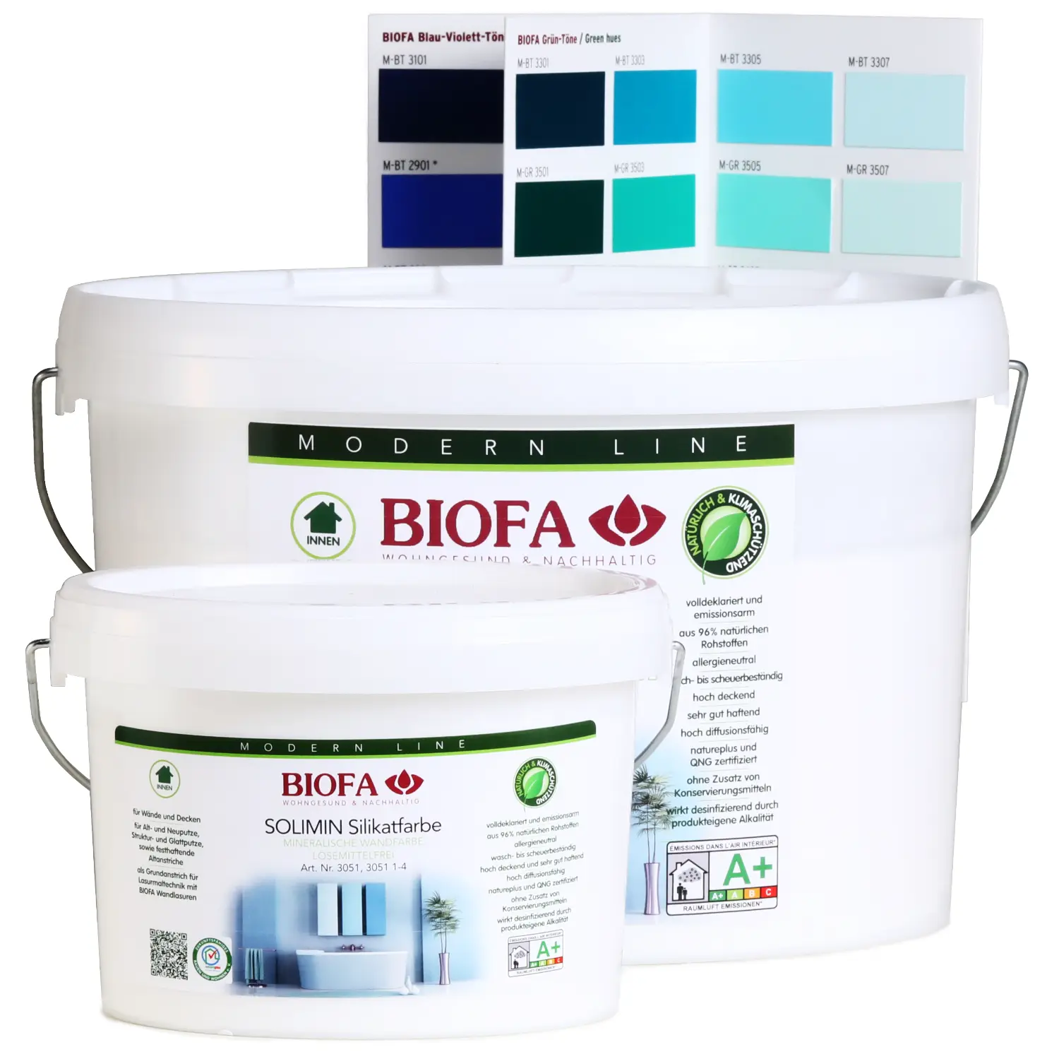 Farbtonabmischungen: Die SOLIMIN Silikatfarbe kann mit den BIOFA Farbpigmenten 1301-1313 und 1305-1307 bzw. ab Werk nach dem BIOFA SILIC-Farbfächer für Mineralfarben abgetönt werden (siehe weiterführende Downloads). Bitte wählen Sie entsprechende Preisgruppe geben Sie im Feld "Gewünschter Farbton", direkt über dem Button "In den Warenkorb", den gewünschten Farbton Ihrer Bestellung ein.