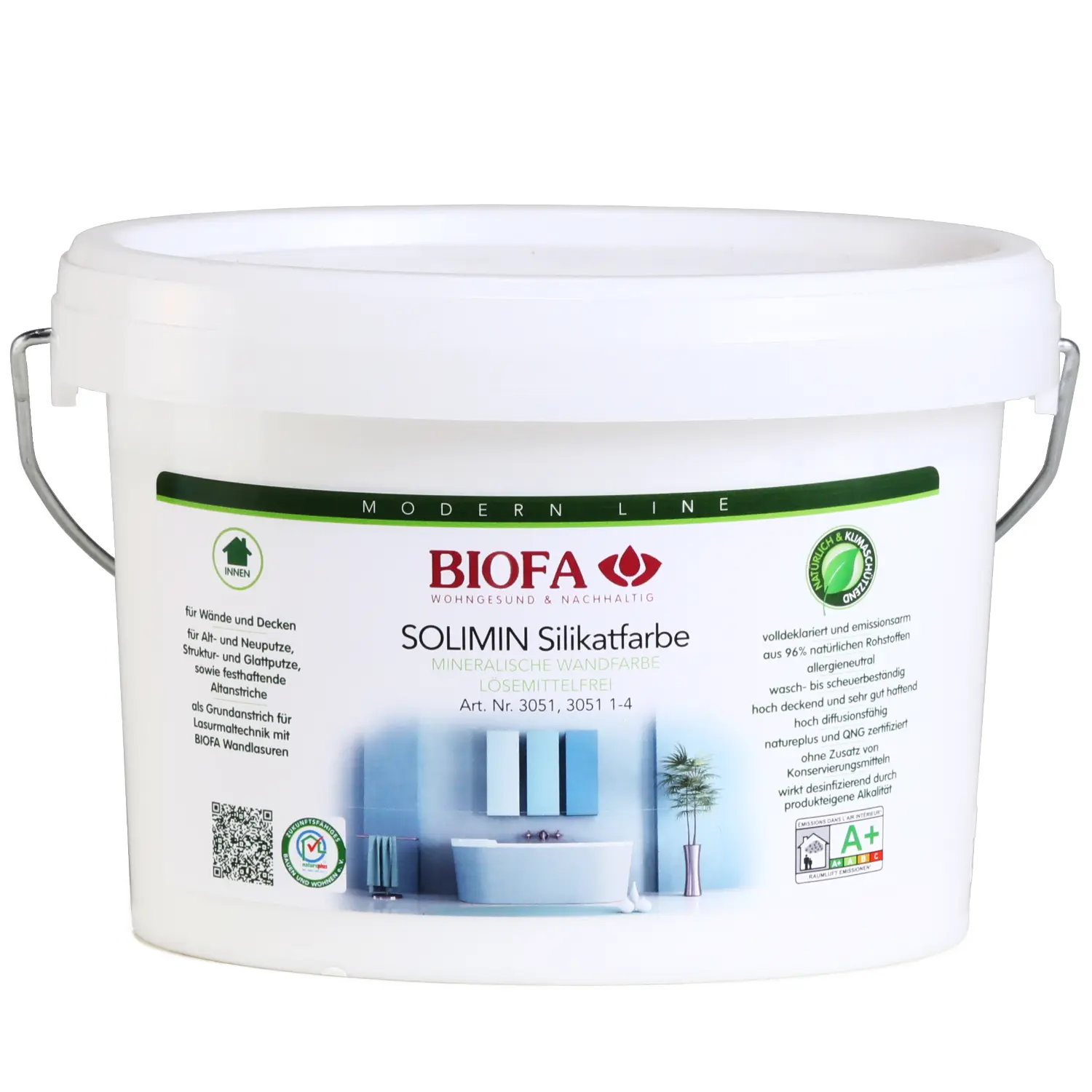 BIOFA SOLIMIN Silikatfarbe ist besonders geeignet für alle öffentlichen Einrichtungen, alle Wandund Deckenflächen in Wohnräumen, Bädern, Küchen, Treppenhäusern und Kellern. Ideal für Feuchträume. Anwendbar auf allen kalk-, zement- und gipshaltigen Putzen, Lehmputzen, Beton, Kalksandstein, Sichtmauerwerk, Raufasertapeten, Glasfasergeweben sowie alten Mineral- und Dispersionsfarben. Kann auch als Untergrund für BIOFA-Lasurmaltechnik verwendet werden.