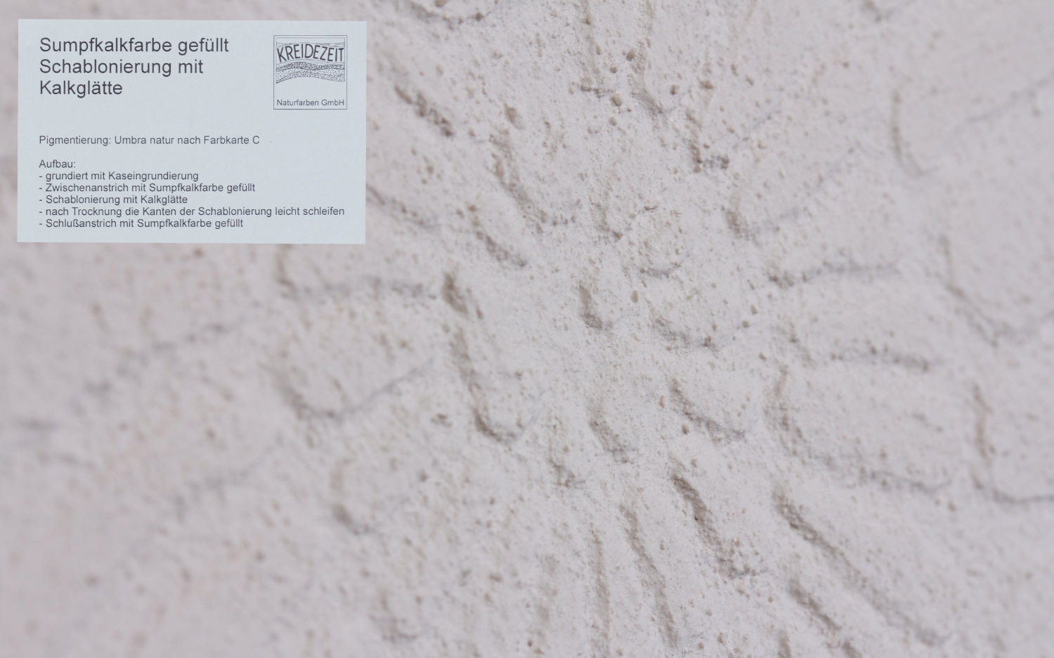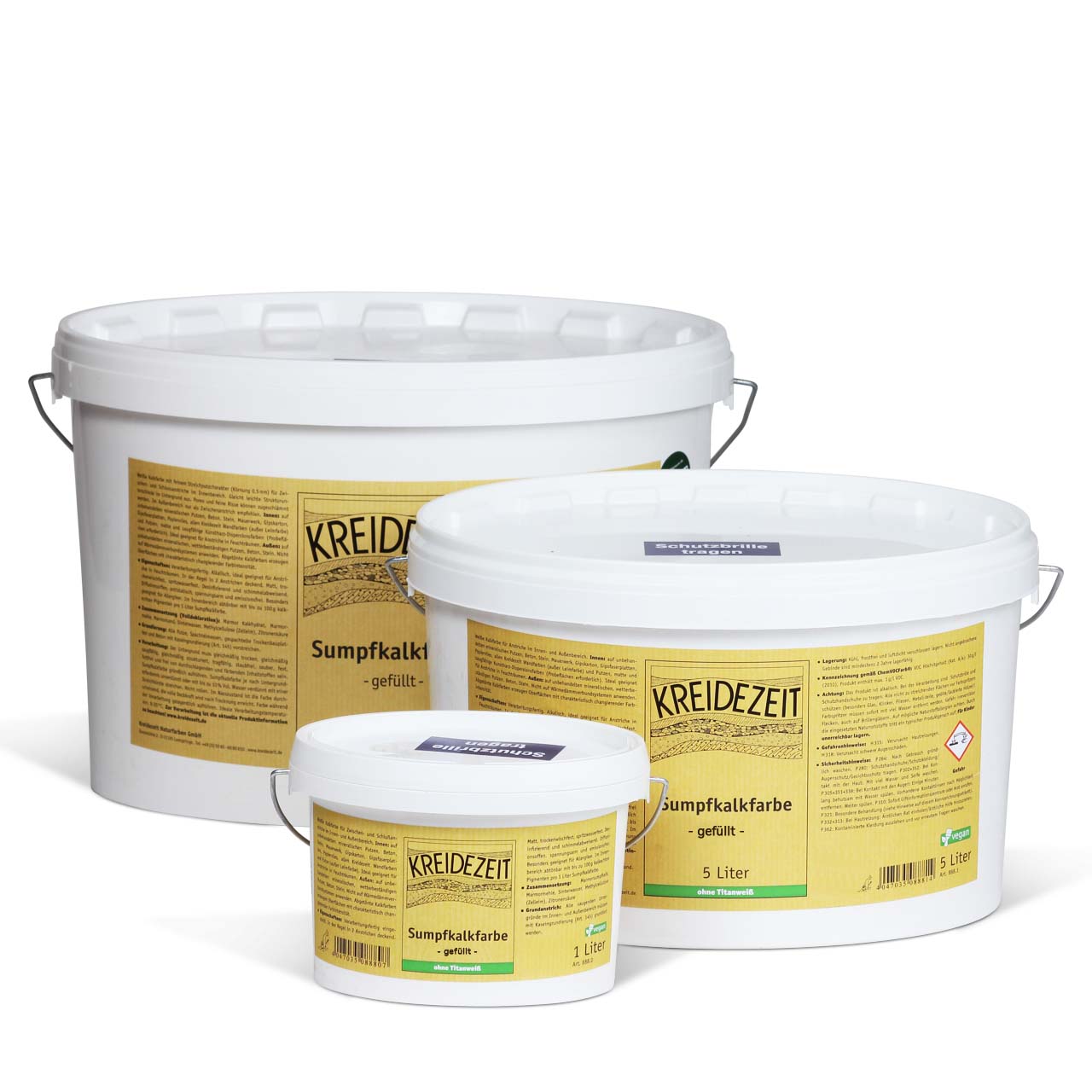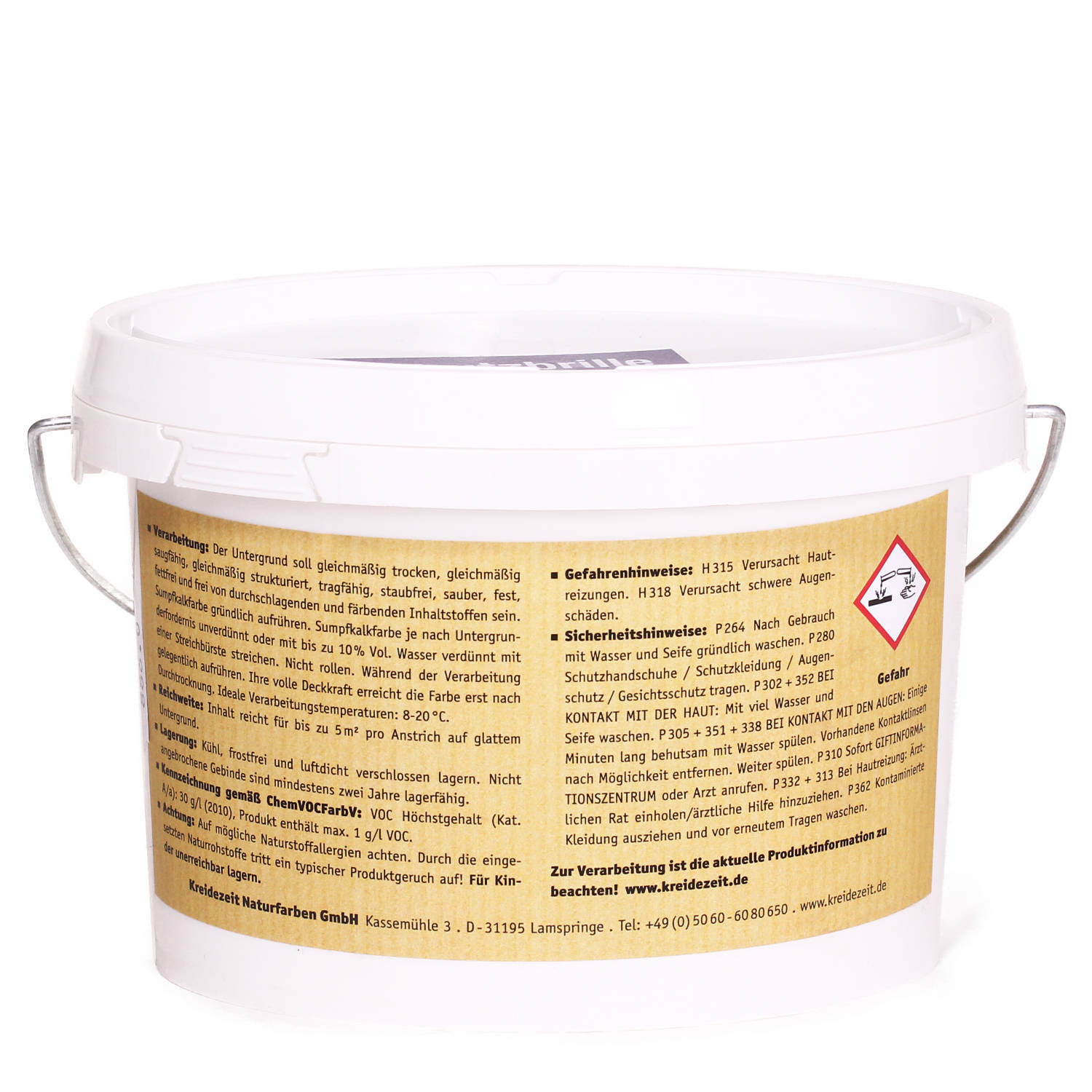KREIDEZEIT Sumpfkalkfarbe ist eine weiße Kalkfarbe nach DIN 55945 für den Innenbereich sowie den Außenbereich. Sie zeichnet sich durch ein für Kalkfarben enormes Binde- und Haftvermögen aus. KREIDEZEIT Sumpfkalkfarbe ergibt durch ein besonderes Herstellungsverfahren ohne Zusatz von Kunstharzbindemitteln, harte und wischfeste Oberflächen. Die Sumpfkalkfarbe erzeugt eine matte, natürlich weiße und glatte Oberfläche Der verwendete Marmorkalk wird unter Einsatz eines Hochgeschwindigkeitsrührers dispergiert, wodurch die einzelnen Kalkteilchen vollständig separiert werden. Die damit verbundene Erhöhung der Gesamtoberfläche aller Kalkteilchen bewirkt eine Maximierung der Carbonatisierungsfähigkeit als auch der Anhaftungsfähigkeit (Adhäsion), so dass KREIDEZEIT Sumpfkalkfarbe auch auf für Kalkfarben normalerweise ungeeigneten Untergründen zuverlässig haftet. Durch Zusatz geringer Mengen Zelleim wird die Rückführung der Kalkteilchen in Agglomerate gebremst und die Lagerstabilität unter Beibehaltung der Bindekraft erhöht. KREIDEZEIT Sumpfkalkfarbe ist angereichert mit fein dispergierenden Marmormehlen und Marmorsanden. Dadurch ist sie in der Regel in 2 Anstrichen deckend. Im Aussenbereich erhöhen 3 Anstriche die Haltbarkeit.Abgetönte Kalkfarben erzeugen Oberflächen mit charakteristisch changierender Farbintensität.