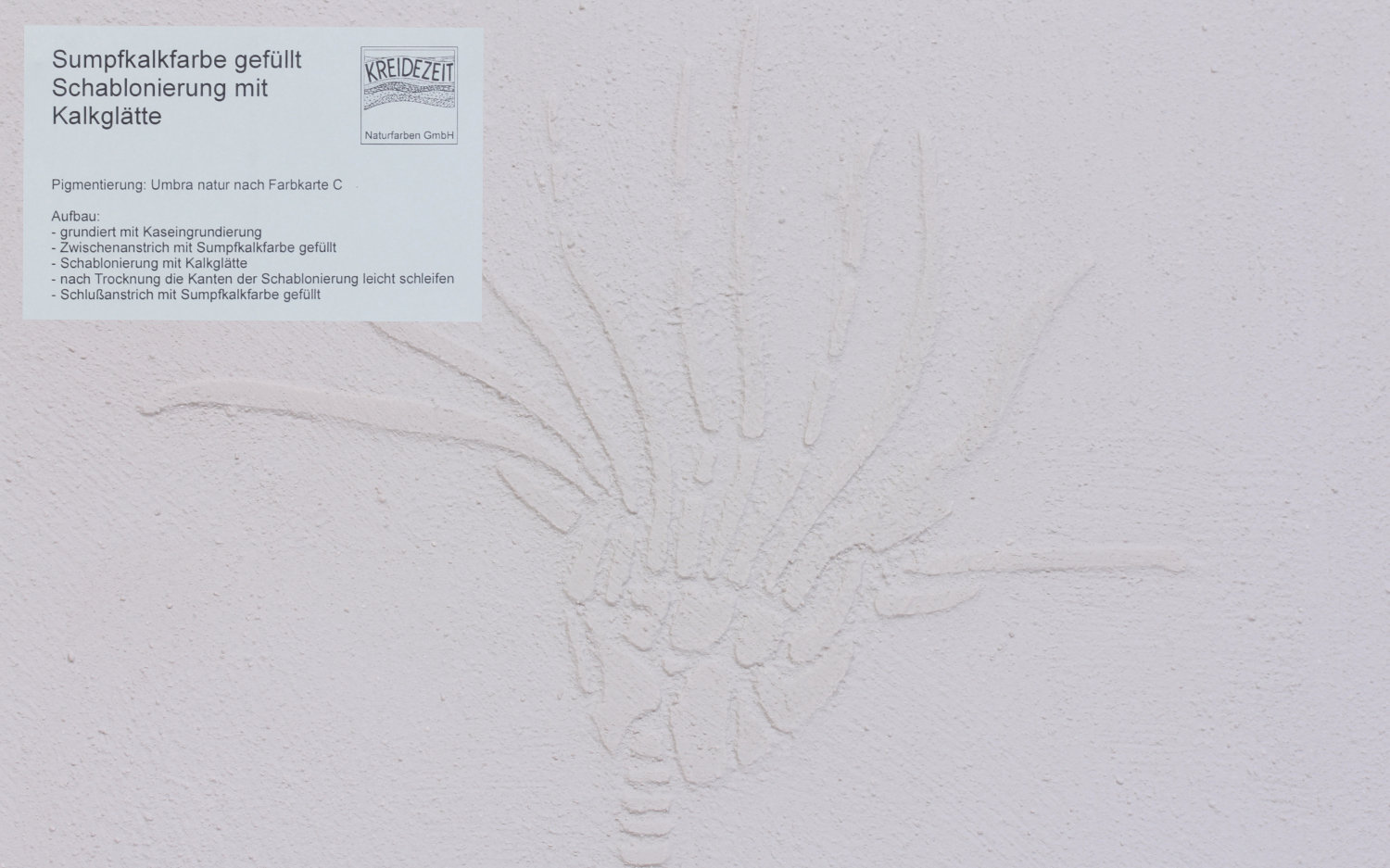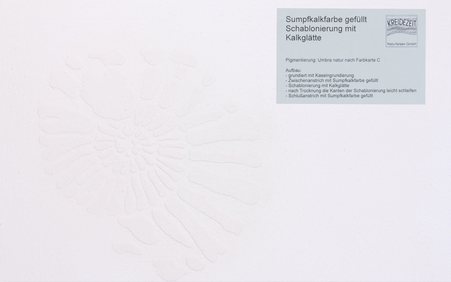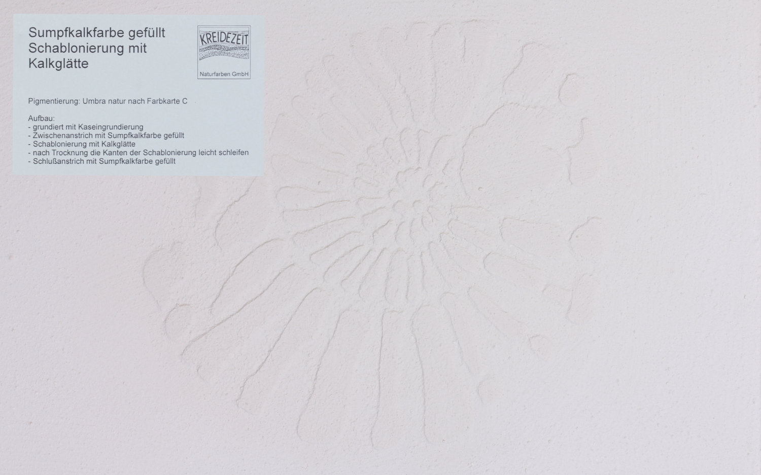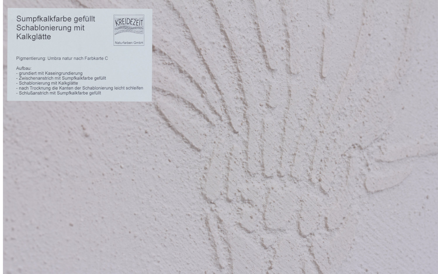 KREIDEZEIT Sumpfkalkfarbe ist eine weiße Kalkfarbe nach DIN 55945 für den Innenbereich sowie den Außenbereich. Sie zeichnet sich durch ein für Kalkfarben enormes Binde- und Haftvermögen aus. KREIDEZEIT Sumpfkalkfarbe ergibt durch ein besonderes Herstellungsverfahren ohne Zusatz von Kunstharzbindemitteln, harte und wischfeste Oberflächen. Die Sumpfkalkfarbe erzeugt eine matte, natürlich weiße und glatte Oberfläche Der verwendete Marmorkalk wird unter Einsatz eines Hochgeschwindigkeitsrührers dispergiert, wodurch die einzelnen Kalkteilchen vollständig separiert werden. Die damit verbundene Erhöhung der Gesamtoberfläche aller Kalkteilchen bewirkt eine Maximierung der Carbonatisierungsfähigkeit als auch der Anhaftungsfähigkeit (Adhäsion), so dass KREIDEZEIT Sumpfkalkfarbe auch auf für Kalkfarben normalerweise ungeeigneten Untergründen zuverlässig haftet. Durch Zusatz geringer Mengen Zelleim wird die Rückführung der Kalkteilchen in Agglomerate gebremst und die Lagerstabilität unter Beibehaltung der Bindekraft erhöht. KREIDEZEIT Sumpfkalkfarbe ist angereichert mit fein dispergierenden Marmormehlen und Marmorsanden. Dadurch ist sie in der Regel in 2 Anstrichen deckend. Im Aussenbereich erhöhen 3 Anstriche die Haltbarkeit.Abgetönte Kalkfarben erzeugen Oberflächen mit charakteristisch changierender Farbintensität.