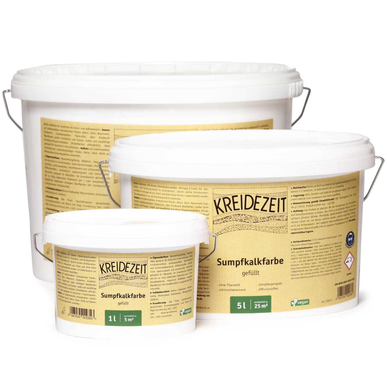 Wir haben unser ganzes Haus - mit großer Anstrengung !! - vor 9 Jahren mit der Sumpfkalkfarbe (gefüllt) gestrichen (von Händlern in der Nähe). Wir hatten keine Ahnung und trauten der Empfehlung einer Freundin. Es war eine supergute Entscheidung. Tolle Optik, tolles Raumklima. Jetzt habe ich 5 l zum Ausbessern nachbestellt.