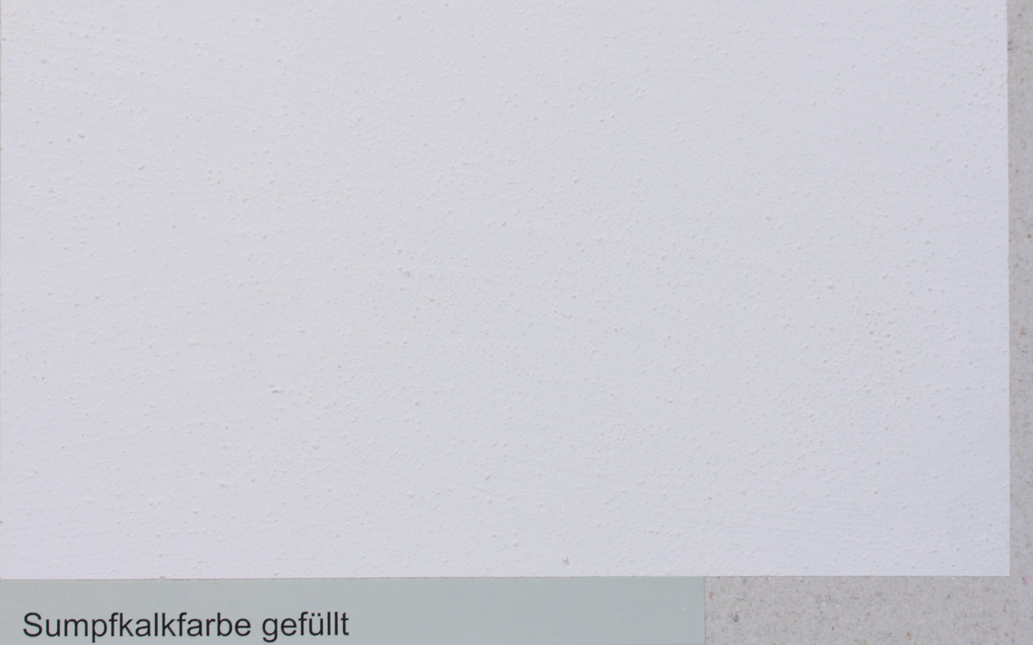- Sumpfkalkfarbe gefüllt: feiner Streichputzcharakter (Körnung 0,5 mm), gleicht leichte Strukturunterschiede im Untergrund aus: Poren und feine Risse können zugeschlämmt werden. Geeignet für Zwischen- und Schlussanstriche im Innenbereich, im Außenbereich nur als Zwischananstrich empfohlen.
