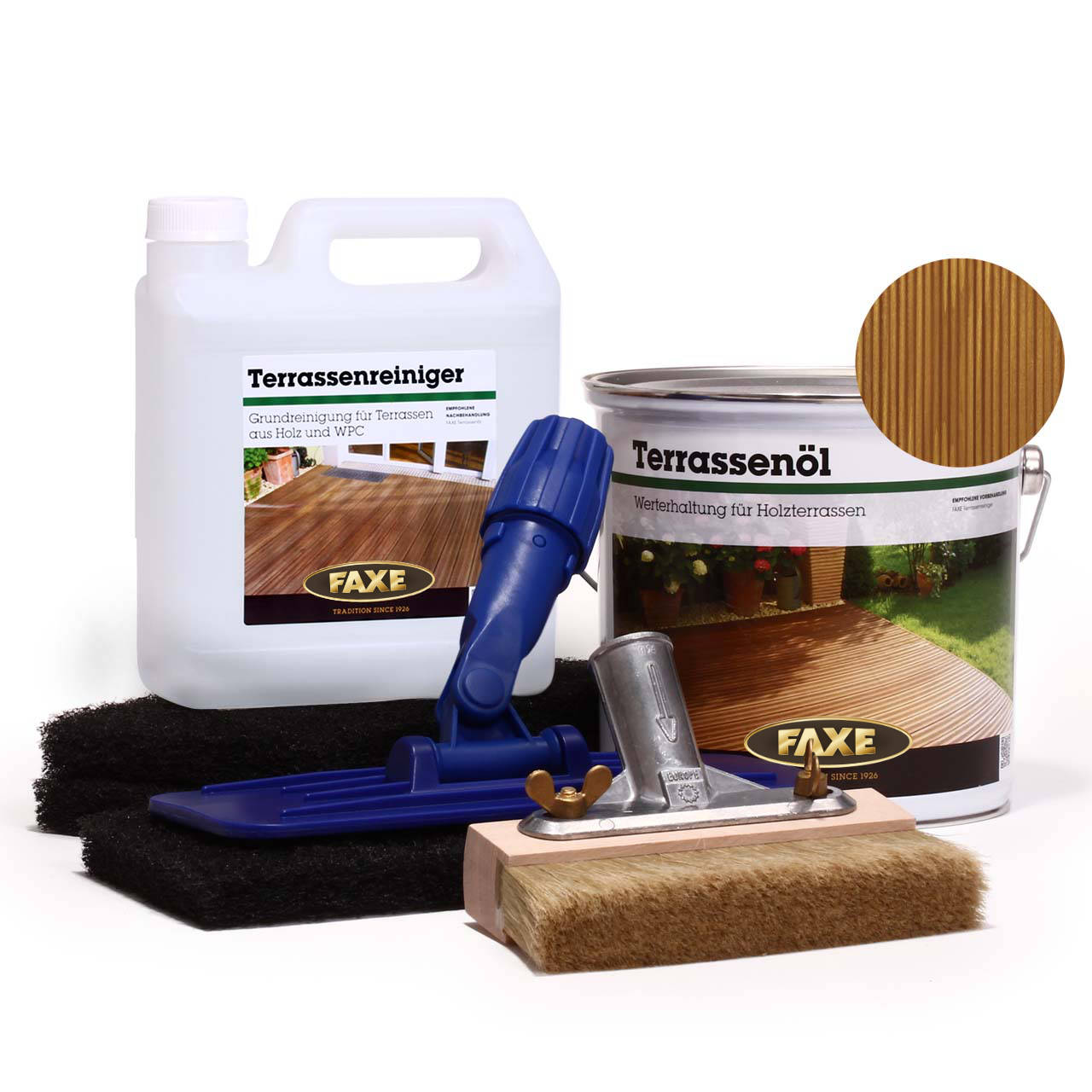 Paket mit Zubehör zur Reinigung und Pflege von Holzterrassen aus Holz.