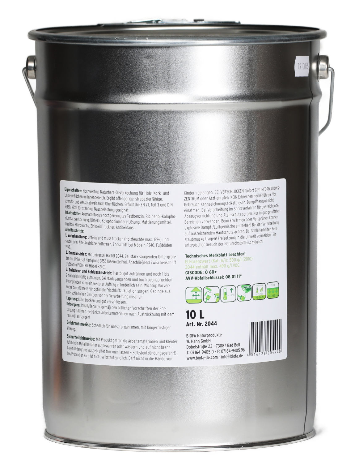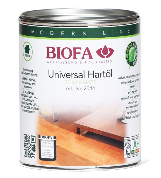 Hochwertiges Hartöl aus natürlichen Rohstoffen. Es belebt die natürliche Struktur, vertieft die Tönung der behandelten Untergründe und ergibt eine offenporige, seidenmatte, strapazierfähige, schmutz- und wasserabweisende Oberfläche, die weitgehend vergilbungsfrei ist. Erfüllt die Norm EN 71, Teil 3 (Sicherheit von Kinderspielzeug) sowie die DIN 53160 (Schweiß- und Speichelechtheit). Das Universal Hartöl eignet sich für saugfähige Flächen im Innenbereich wie Fußböden aus Holz, Kork und Linoleum, Treppen, Möbelaußenflächen, Sterling OSB-Platten und Innenausbauten. Erfüllt die Anforderungen der Parkettnorm DIN EN 14342.